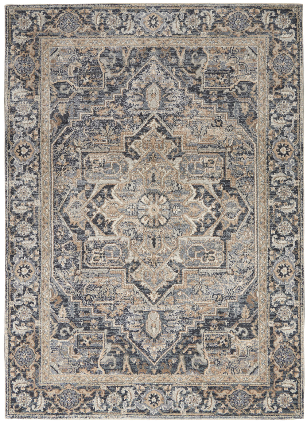 A richly ornate Oushak rug design combines with subtle abrash shades of navy and beige in this Moroccan Celebration rug from kathy ireland® Home. Power loomed for durability and easy care, this border and center medallion rug design creates a dramatic centerpiece for any space.