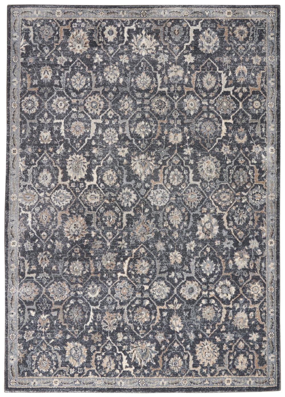 With a deep abrash navy blue field, this traditional bordered Persian rug design from the Moroccan Celebration Collection provides a regal elegance to any room in the home. Power loomed for durability and easy care, with the style and grace that exemplifies kathy ireland® Home.