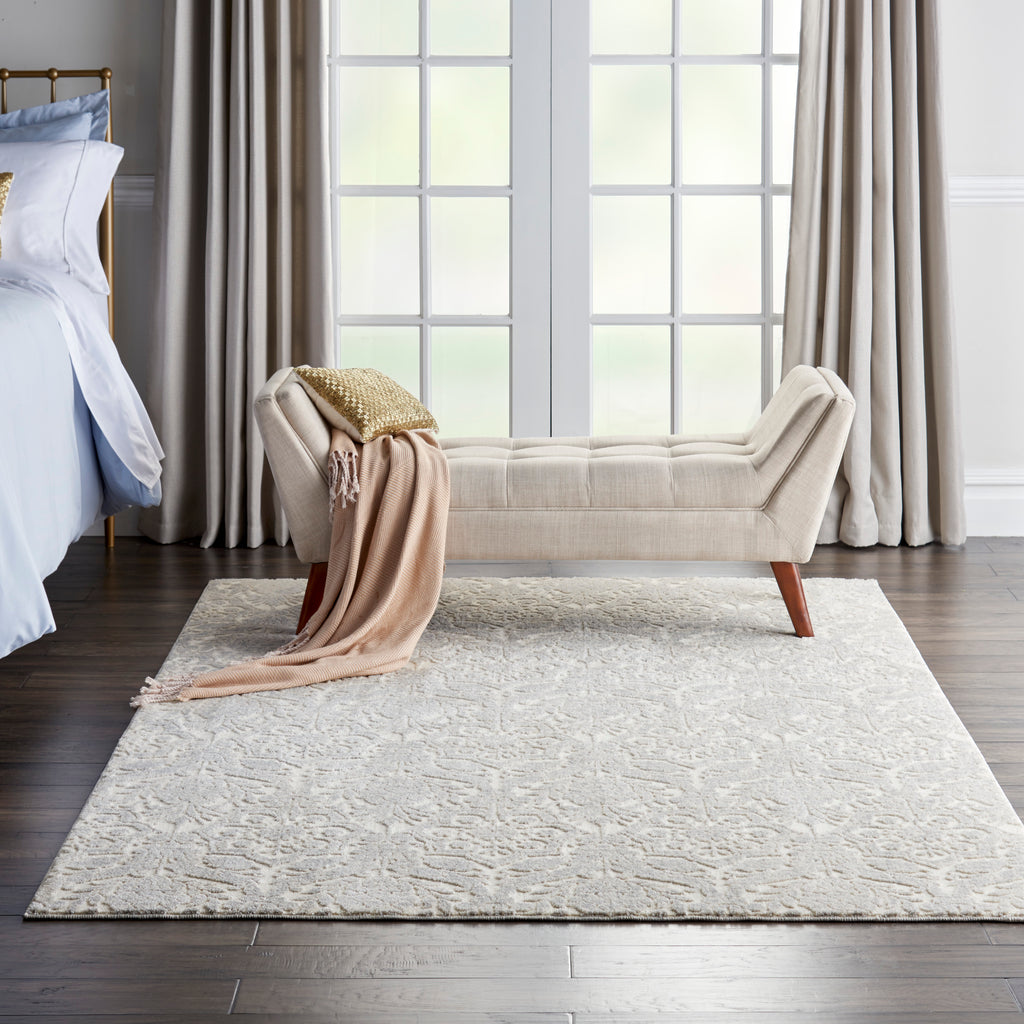 The stunning Sahara rugs by kathy ireland® Home bring sophisticated, modern flair to a desert-inspired color palette. Ranging from vintage damask patterns to artistic, contemporary abstract patterns, these rugs are richly textural, adding warmth and excitement to any room. The subtle yet striking palette mixes creamy neutrals in the color families of ivory, platinum, silver, and slate. Power loomed for a lush pile in modern, easy-care fibers.