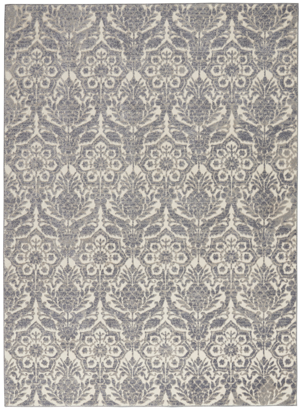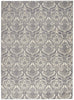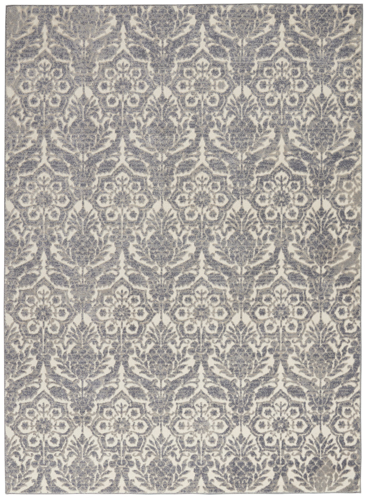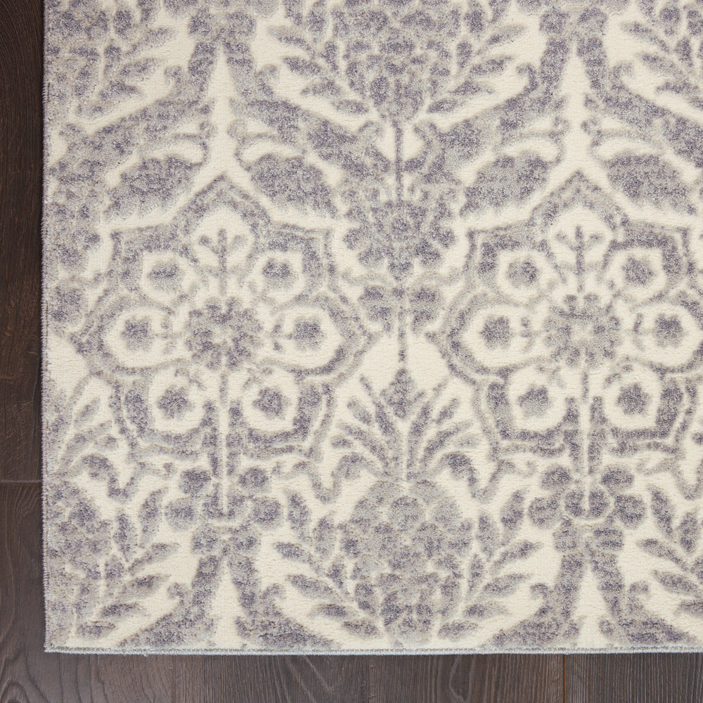 With detailed damasks and floral patterns in grey and ivory, this Sahara Collection rug from kathy ireland® Home exudes a quaint, vintage feel, with soft and inviting easy-care pile. This floral rug works perfectly in country décor, but is versatile enough for virtually any setting.