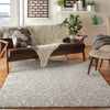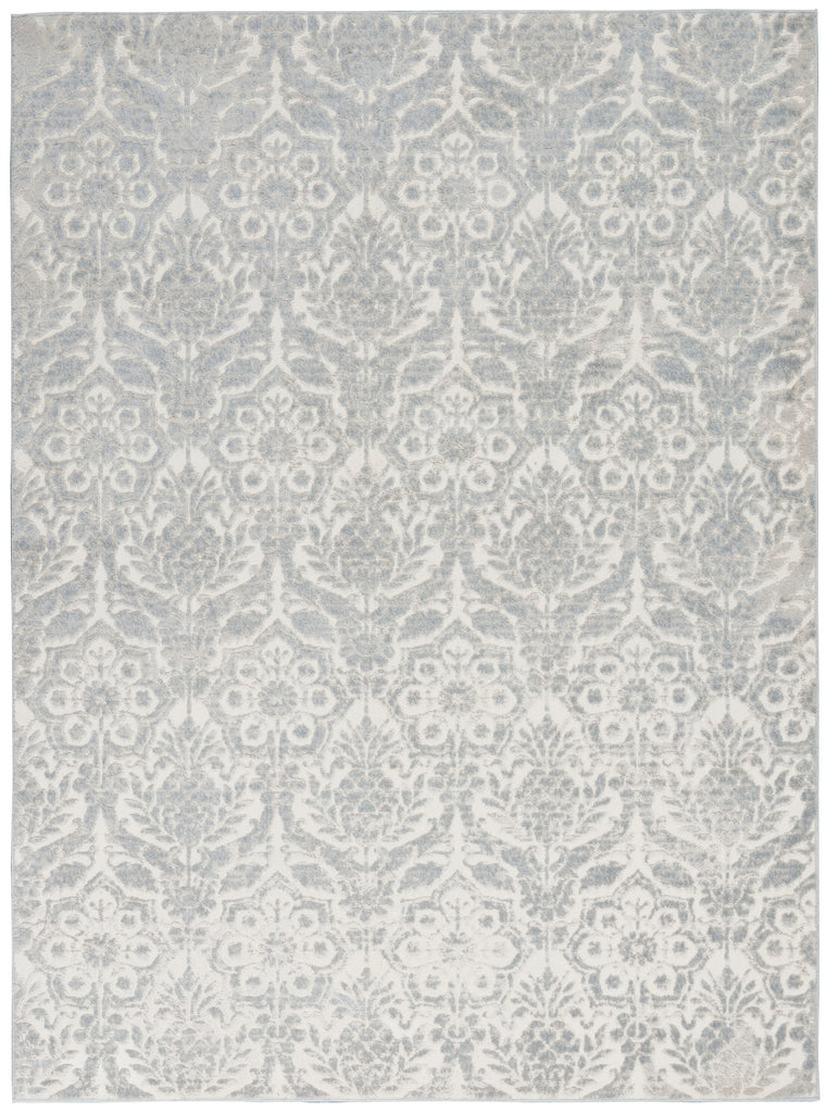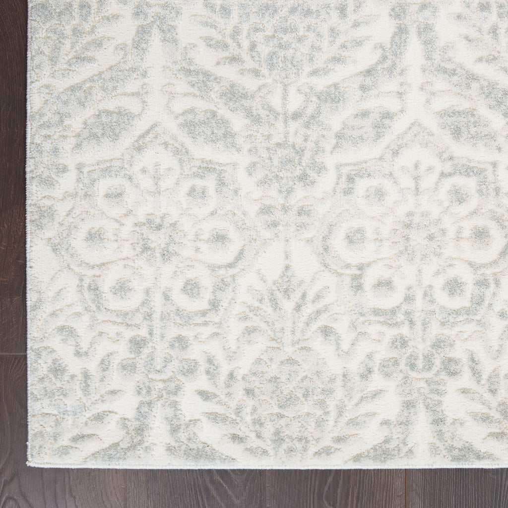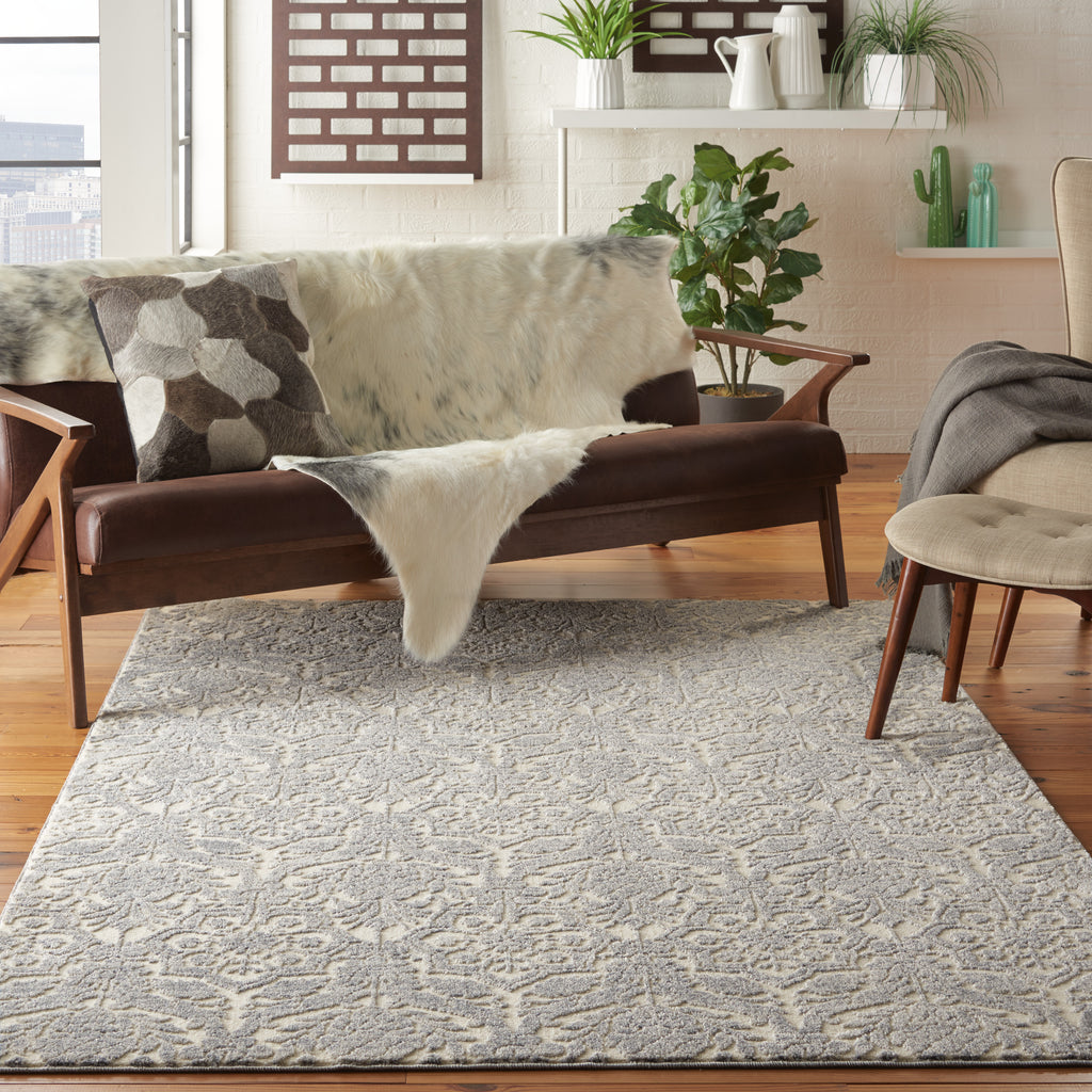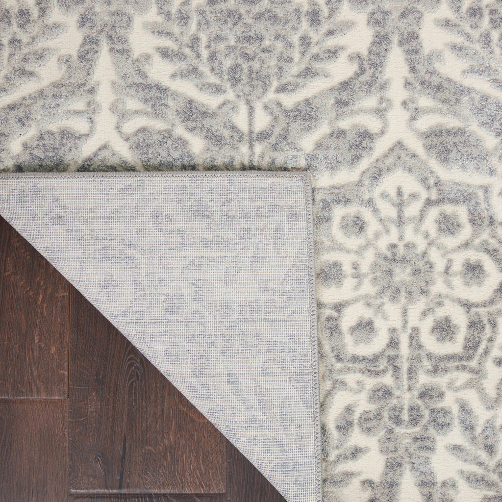 With detailed damasks and floral patterns in grey and ivory, this Sahara Collection rug from kathy ireland® Home exudes a quaint, vintage feel, with soft and inviting easy-care pile. This floral rug works perfectly in country décor, but is versatile enough for virtually any setting.