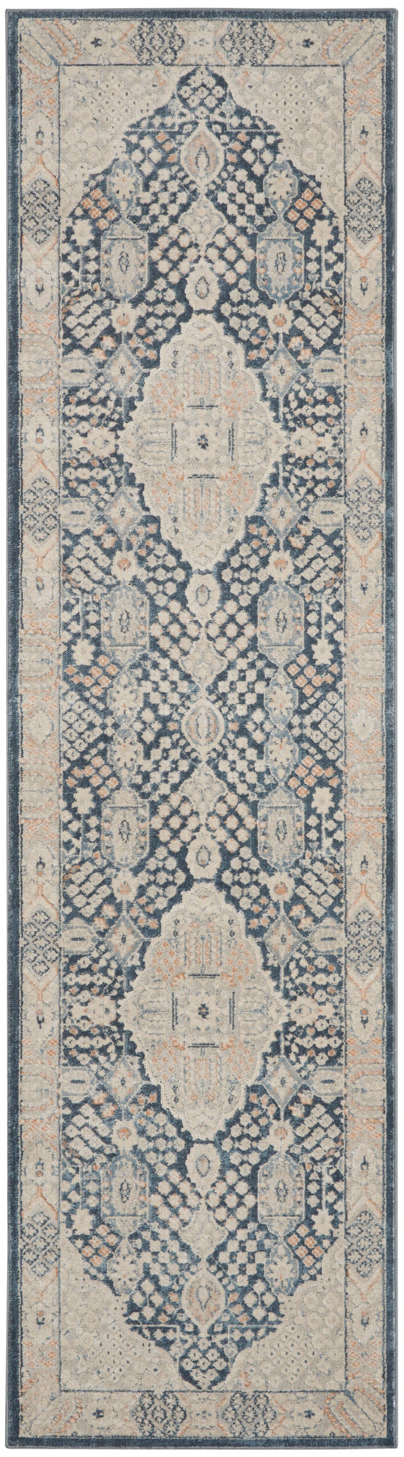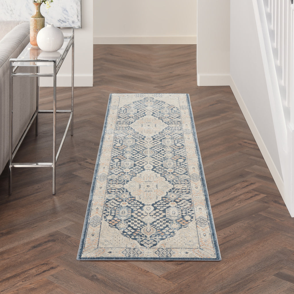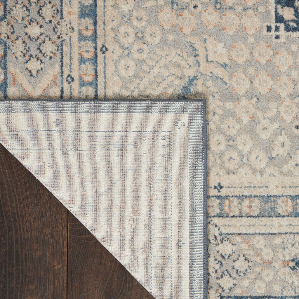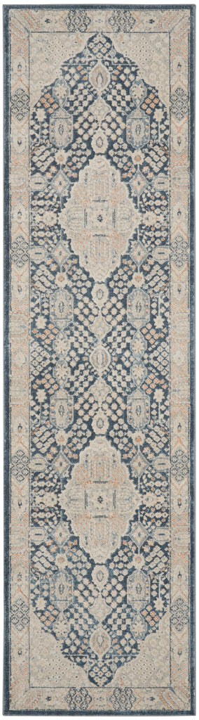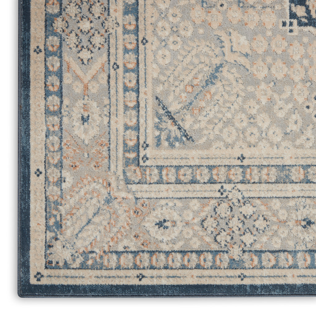 The drama of this center medallion kathy ireland® Home Malta area rug is softened by its muted, blue-grey palette with vintage washed finish. Silky and luminous in modern, easy care fibers ideal for the contemporary lifestyle. An ornate border and fabulous cut-pile texture completes its appeal.