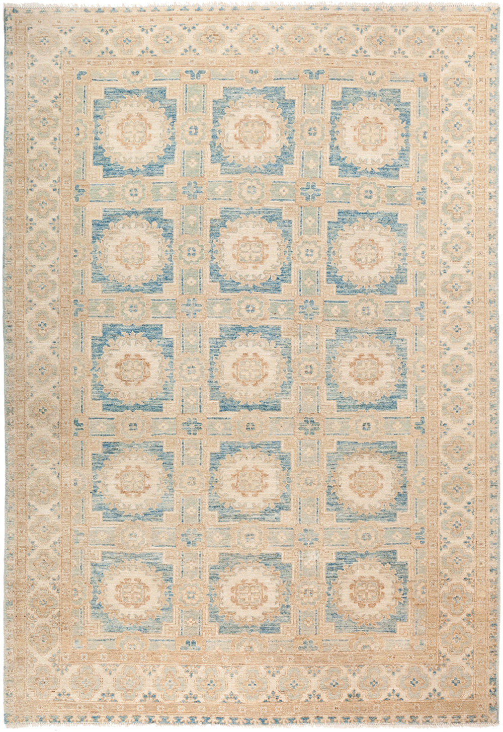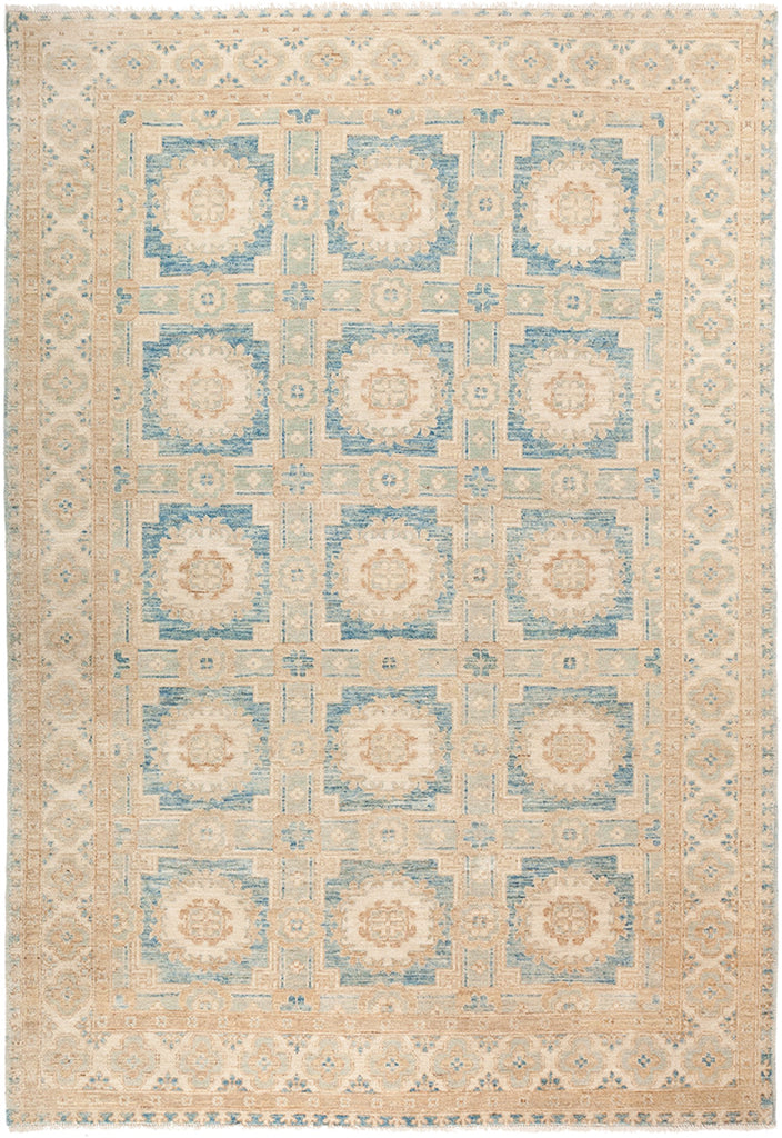 These rugs develop the decorative schemes of late 19th century Turkish carpets. These rugs have large simplified patterns in light tonalities featuring ivory, pale blue, rust, salmon and light green. The origin of these patterns derive from Persia, but the rendition is strictly more modern and decorative. These carpets can be found in various color ways and in an almost infinite range of patterns suitable for every home.
