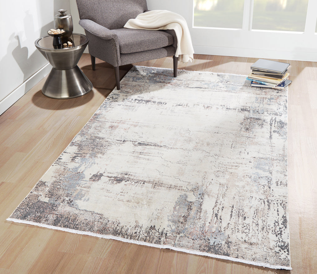 The contemporary movement of this modern area rug explores implied textures through sumptuous synthetic fibers. Dove gray, brown and white tones evoke urban sensibilities with an abstract design that evokes the look of peeling plaster. A combination of silky viscose and polyester threads create a subtle shimmering effect that makes this decorative rug a coveted floorcovering for every room.