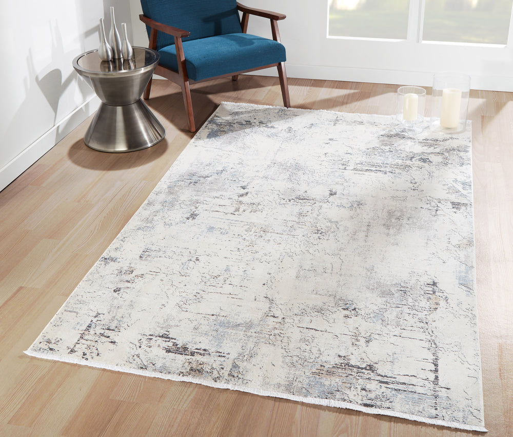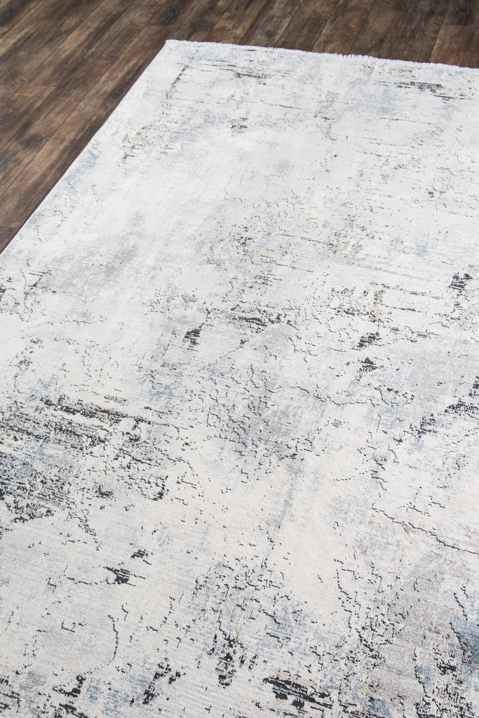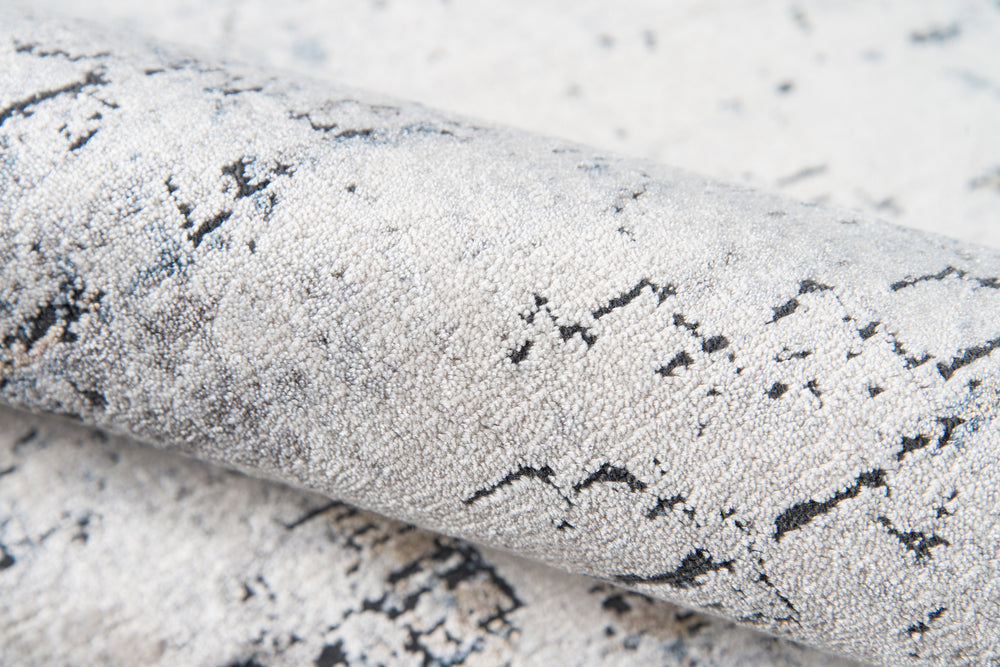 Layers of cement on pavement inspire the contemporary composition of this modern area rug that brings street style to interior spaces. The abstract rug design incorporates shades of ivory, gray and black to create an array of implied textures that take inspiration from industrial surfaces. A combination of silky viscose and polyester threads create a subtle shimmering effect that makes this decorative rug a coveted floorcovering for every room.
