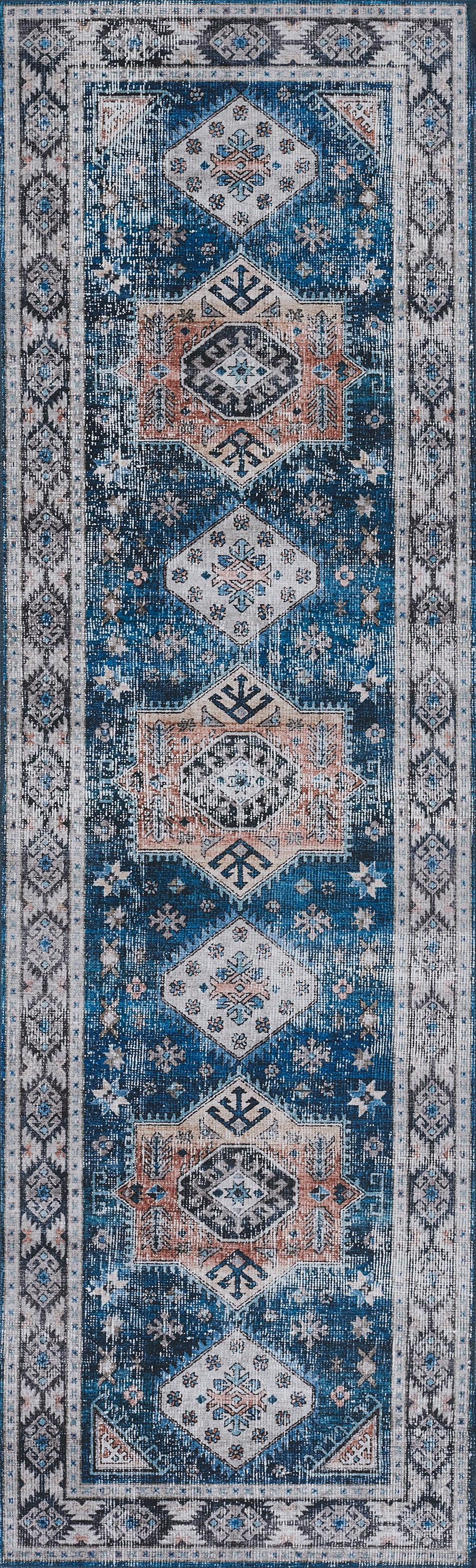 This blue-hued rug is rich in its color, texture, and design. With dark contrasting geometric shapes and patterns brought to life with a distressed and worn-in look, this piece will cool down and ground any interior space. Flat-woven with polyester fibers, you’ll love how durable and affordable it is.