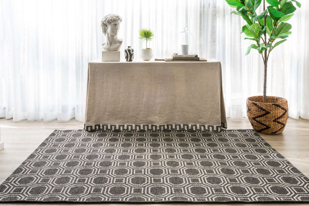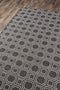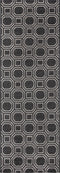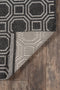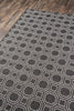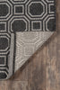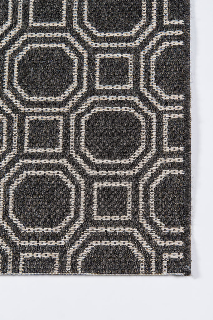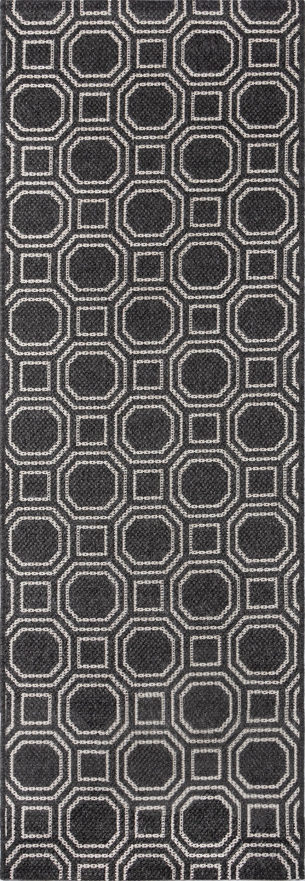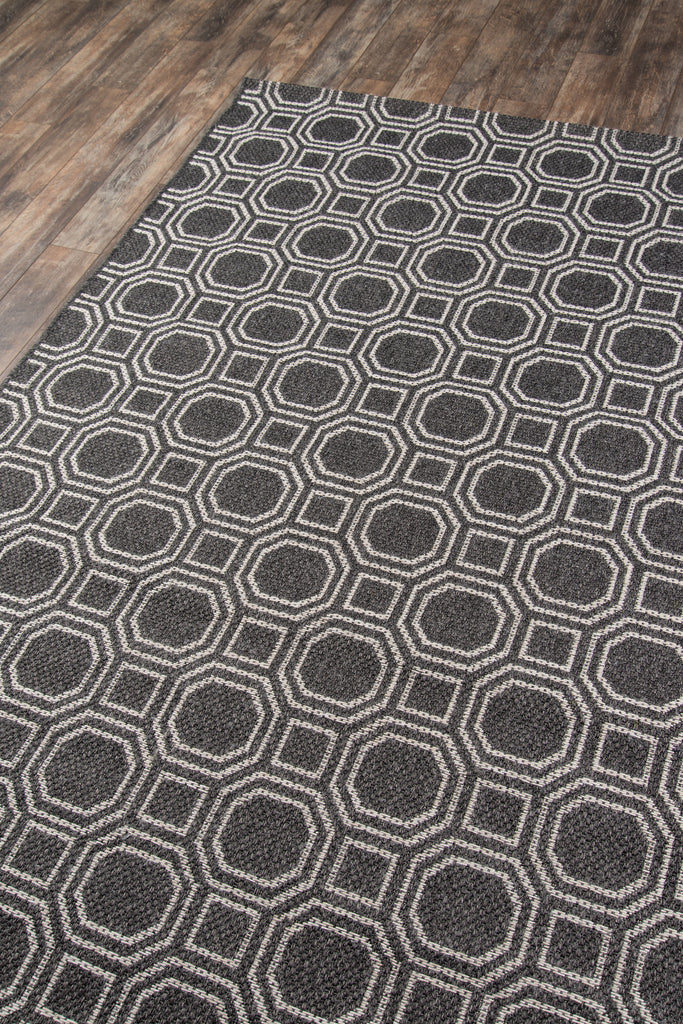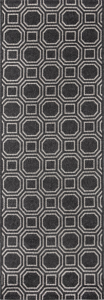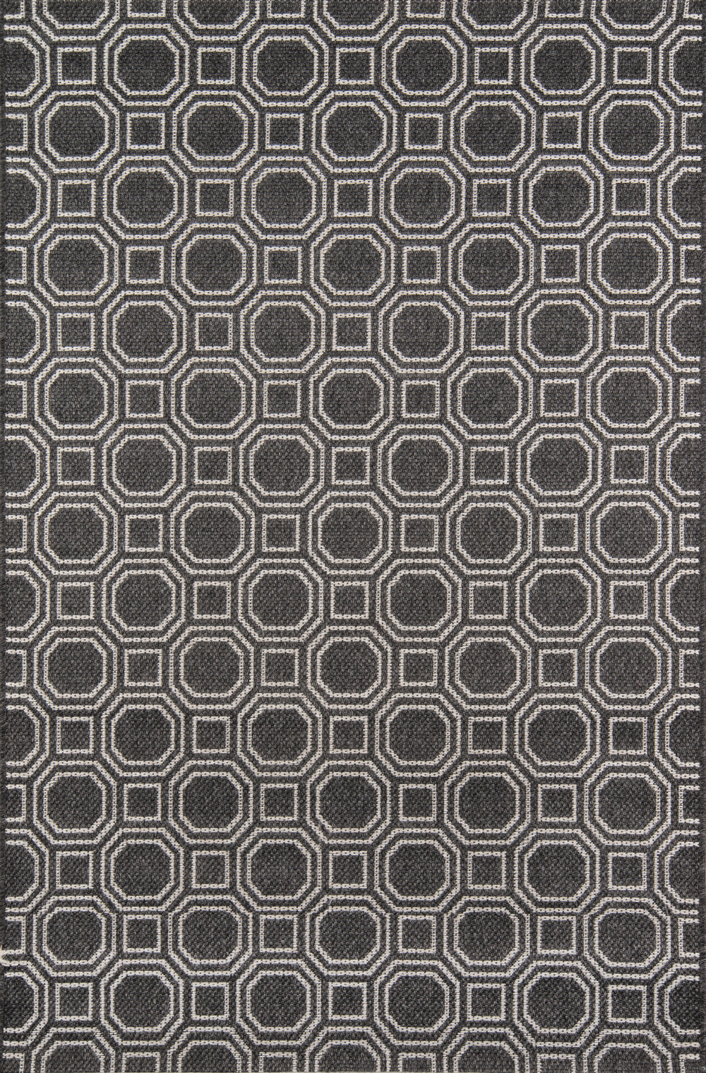 Adorn the floors of your modern abode with the style and symmetry of this indoor/outdoor area rug. The geometric design honors the architectural details of coffered ceilings, using a graphic repeat of white square and octagon shapes to develop depth and dimension throughout the charcoal grey field. Constructed from sturdy synthetic fibers, the all-weather floorcovering creates a coordinated look for interior and exterior spaces alike with a low maintenance fabrication ideal for leisurely living.