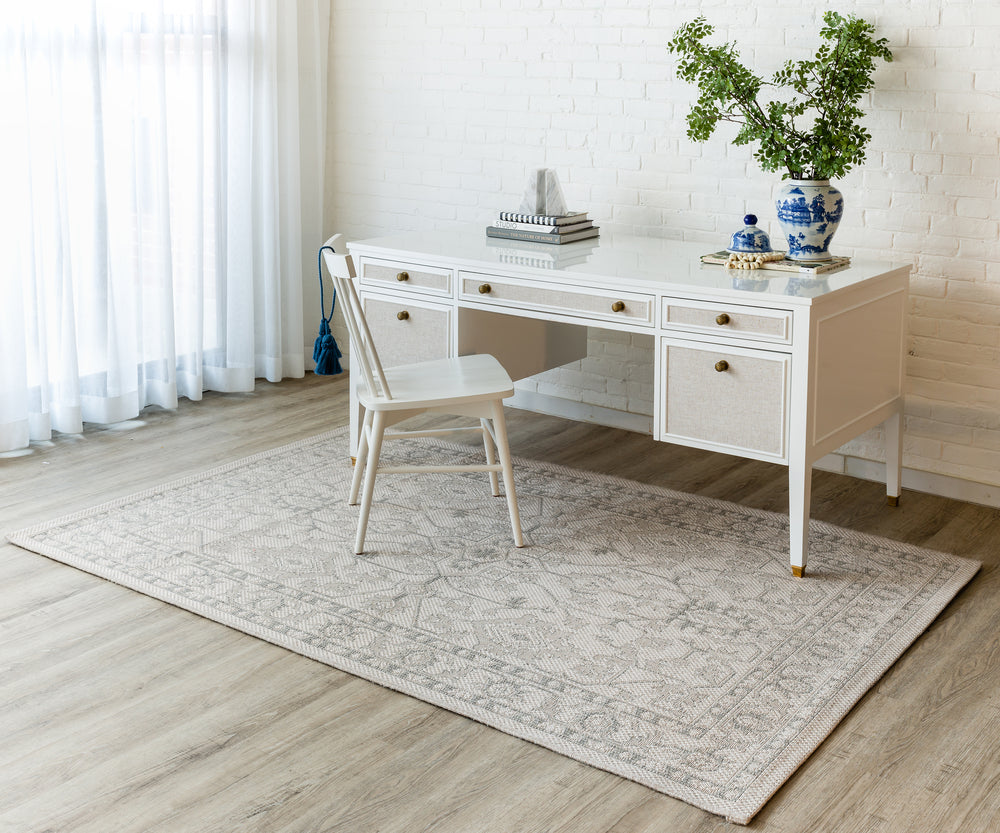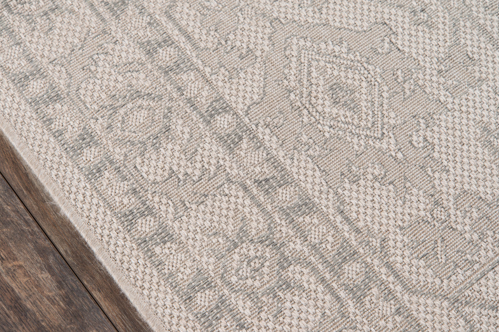 Designed with active lifestyles in mind, this indoor/outdoor area rug brings a tried-and-true traditional pattern beyond the threshold of the home. The rectangular field and surrounding border are resplendent with ornamental tracery and floral filigree captured in monochromatic shades of gray. Constructed from sturdy synthetic fibers, the all-weather floorcovering creates a coordinated look for interior and exterior spaces alike with a low maintenance fabrication ideal for leisurely living.