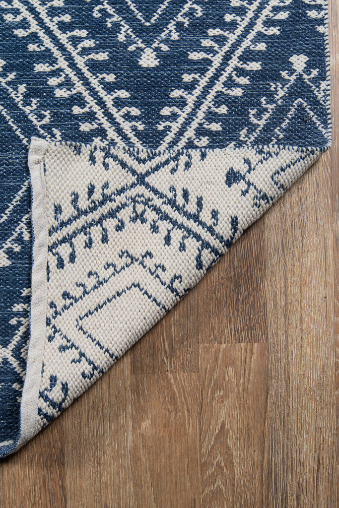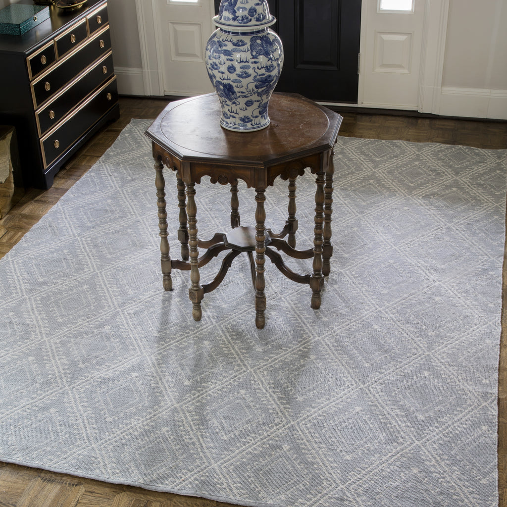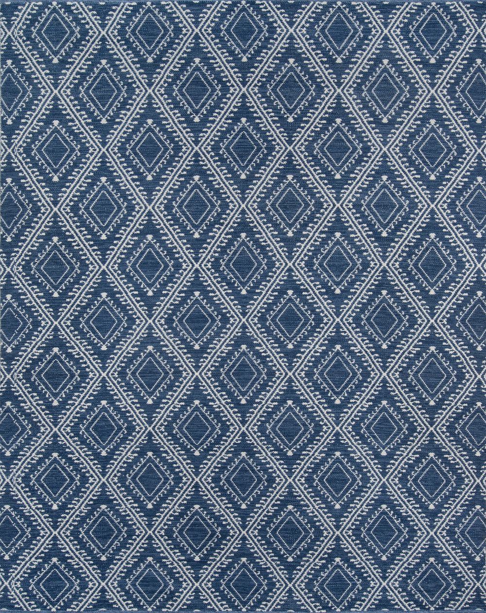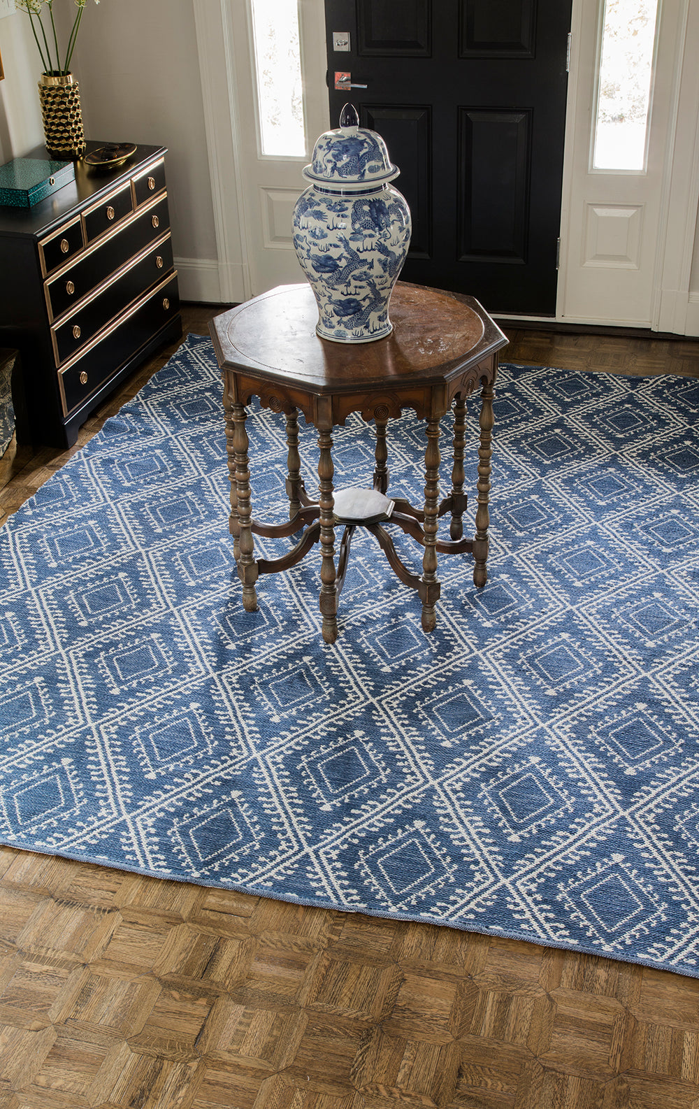 Tone-on-tone textures abound in this decorative rug with tribal influences. Hand woven from soft synthetic fibers, each diamond and herringbone patterned rug takes inspiration from traditional Kilim carpets to create repeating motifs that are thoroughly modern. Styles range in subdued shades of soft brown to indigo blue in a bohemian palette that looks beautiful in formal and casual spaces.