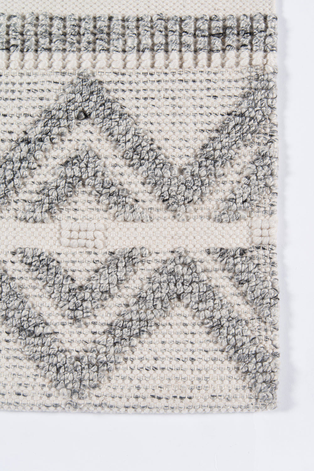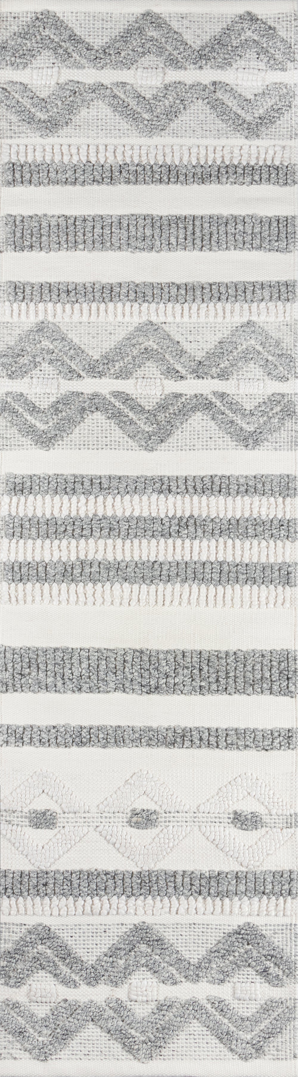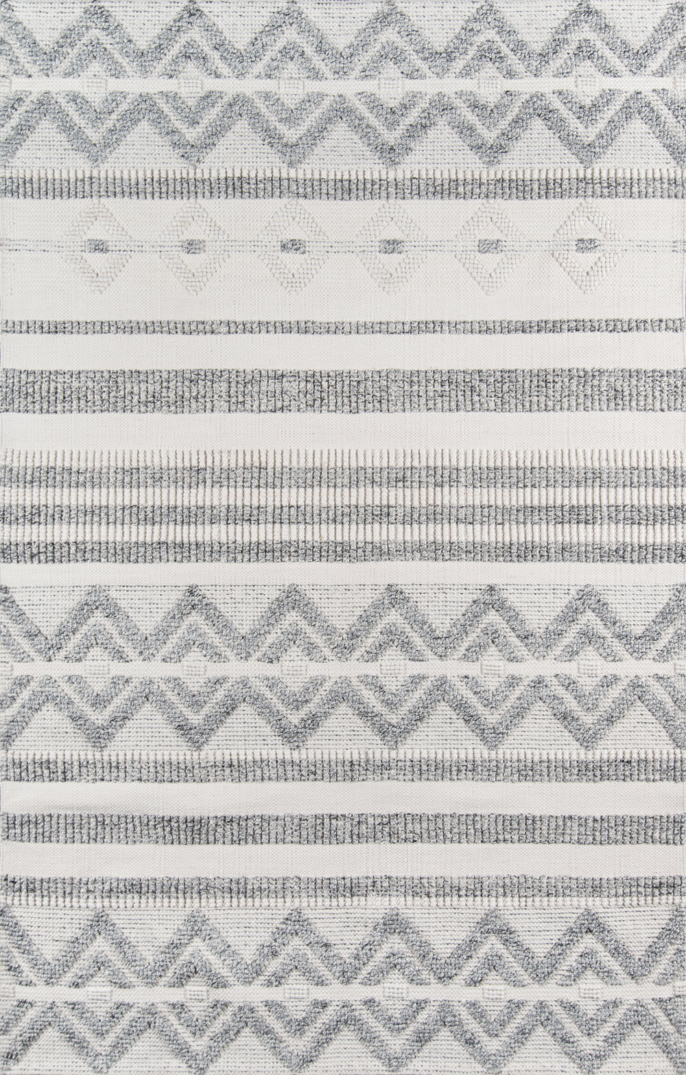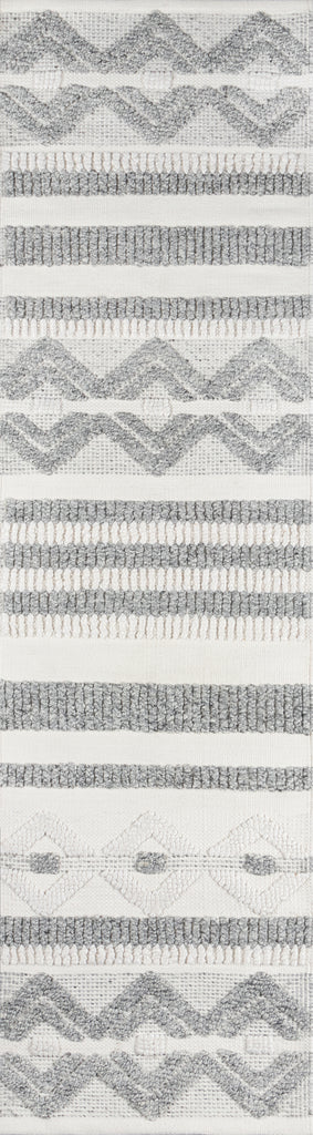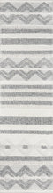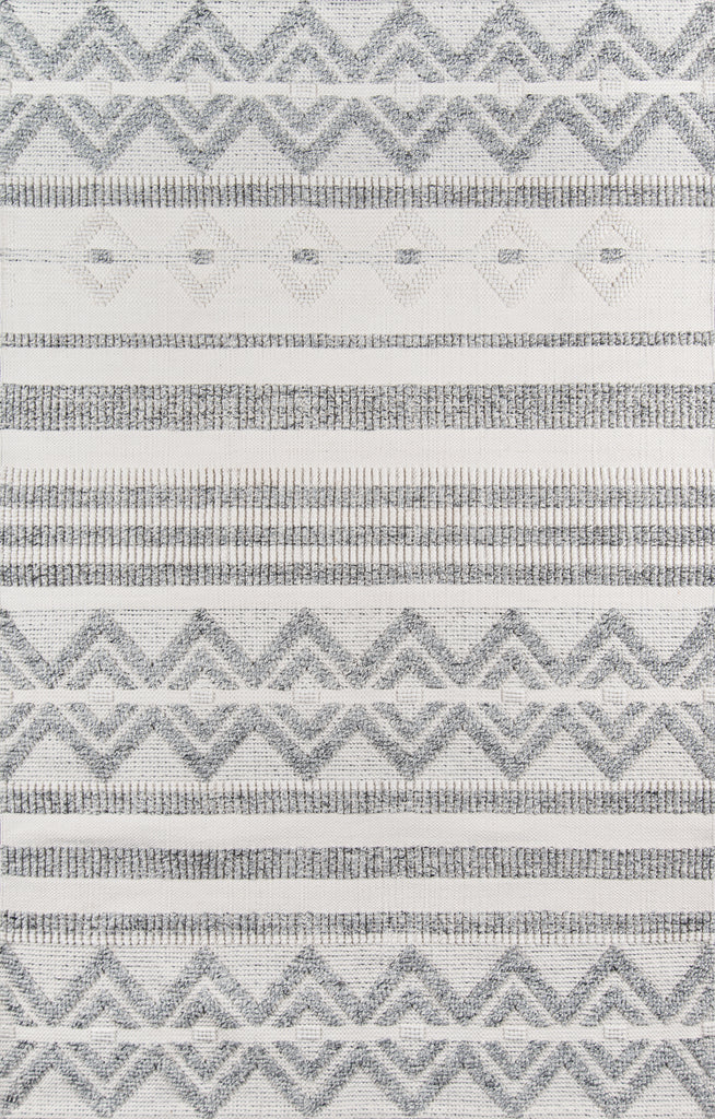 A tribal pattern in a minimalist color palette gives this eclectic area rug understated appeal. Alternating between linear stripes and concentric diamond shapes, relaxed ivory and grey shades keep the chic design casual under coffee tables, couches and other interior furnishings. Crafted for comfort in every room of the house, the decorative floorcovering is hand tufted from high-traffic PET fibers that stand up to the standard day-to-day routine.
