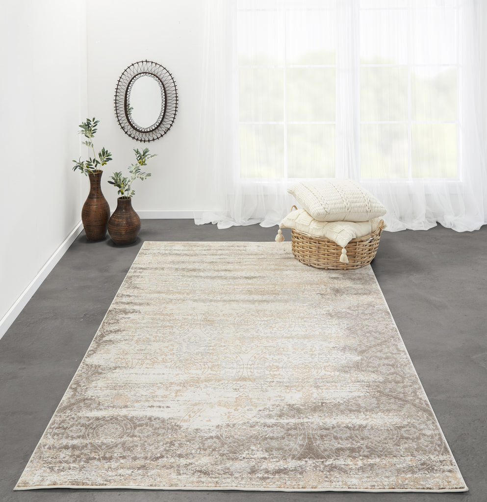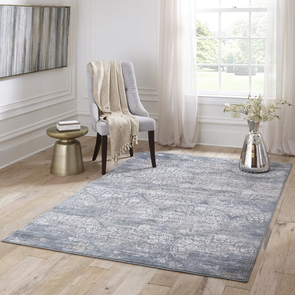 The distressed look of this transitional area rug adds instant beauty and intricate details to interior spaces. A combination of polypropylene and viscose fibers create an assortment of area rugs with a silky soft hand and timeworn textures, as soft synthetic threads reveal traditional patterns with vintage appeal. Power loomed for lasting comfort and durability, the striated colors give each decorative pattern a slightly deconstructed appearance, perfect for eclectic rooms with an appreciation for antique wares.
