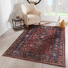 The nomadic style of this traditional area rug calls on design elements from all corners of the globe. Burgundy red serves as the base for the ornamental field and triple border design that boasts a stunning array of iconic Persian carpet motifs in shades of chambray blue and gold. Long-wearing polyester threads are suited to style just about any space, making this decorative floorcovering a versatile design accent on floors throughout the home.