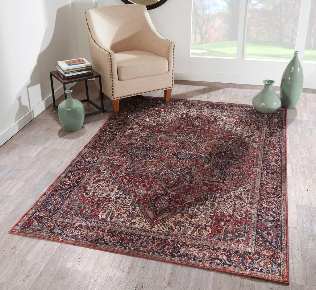 Available in an array of ancient patterns, this traditional area rug collection adds timeless integrity to interior floors. Regal shades of red, blue, ivory and gold are an invitation to explore the exquisite tracery, flower and central medallion shapes essential to Serapi and Tabriz carpets. Resilient polyester threads preserve the heritage of Persian designs for decades to come with an innovative fiber that’s luxe and long lasting.