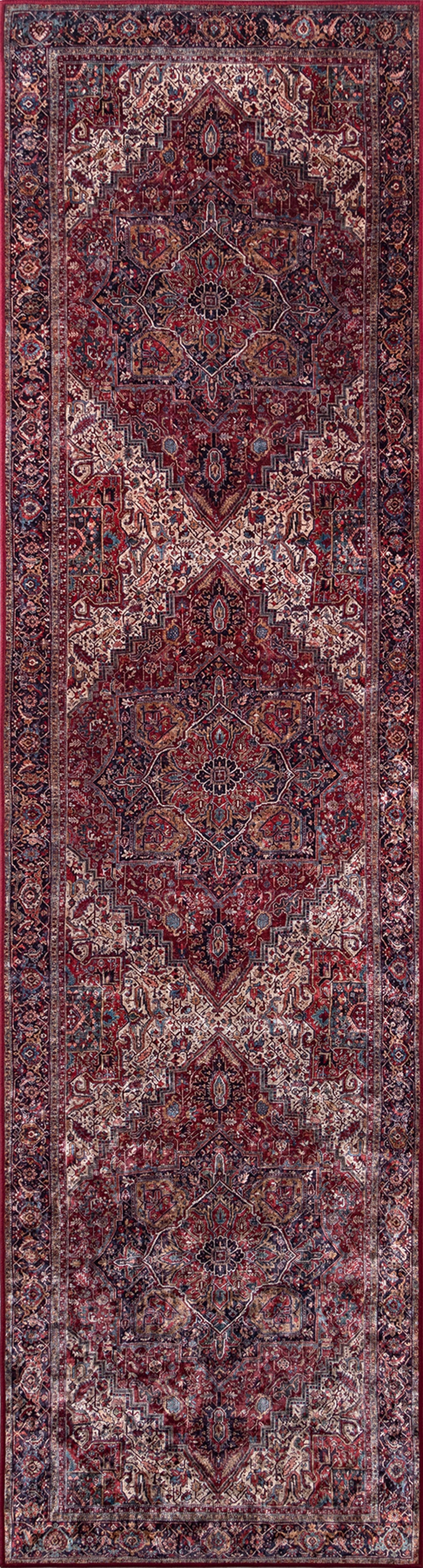 The enduring beauty of this Old World-inspired area rug is a touchstone for designing the traditional room. The rectangular rug format boasts a dazzling array of antique Persian carpet motifs, its intricate tracery and botanical themes artfully illustrated in burgundy red and blue. Long-wearing polyester threads are suited to style just about any space, making this decorative floorcovering a versatile design accent on floors throughout the home.
