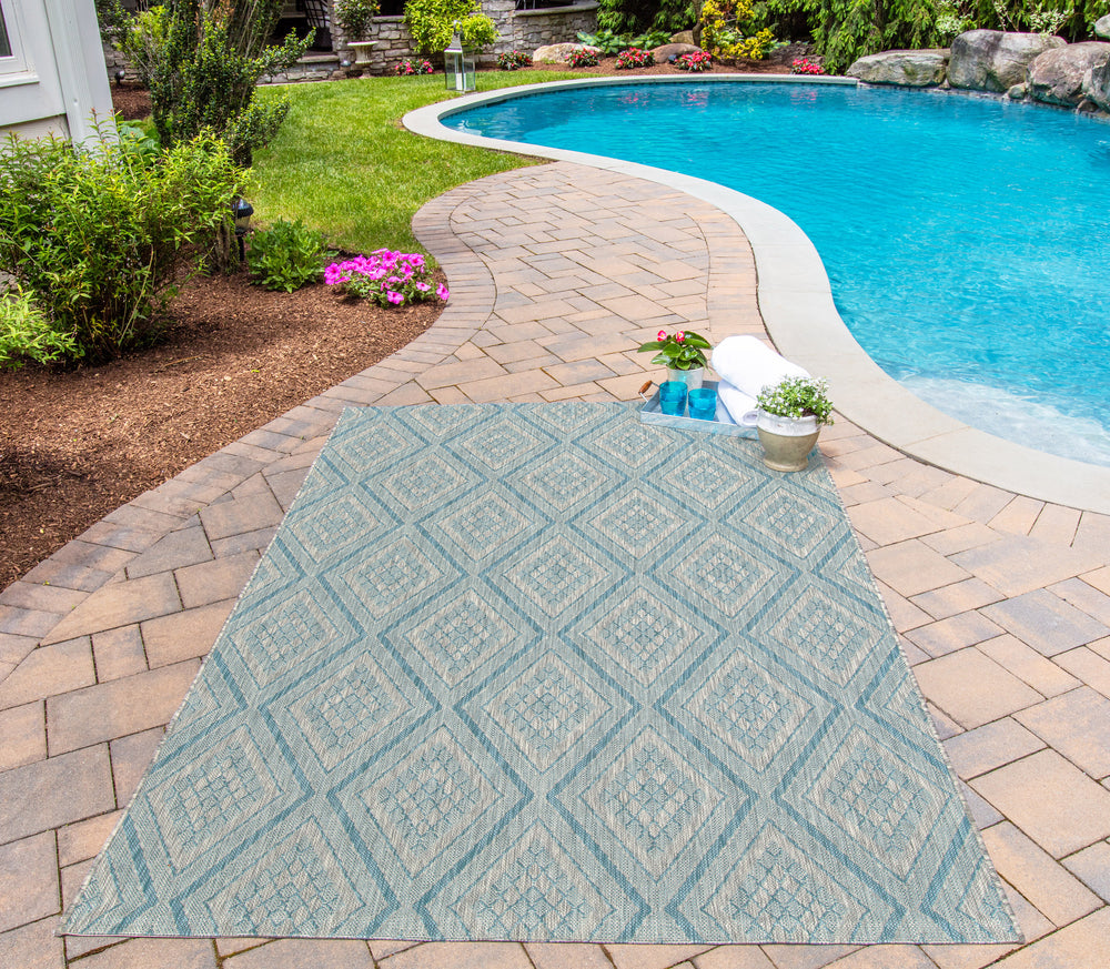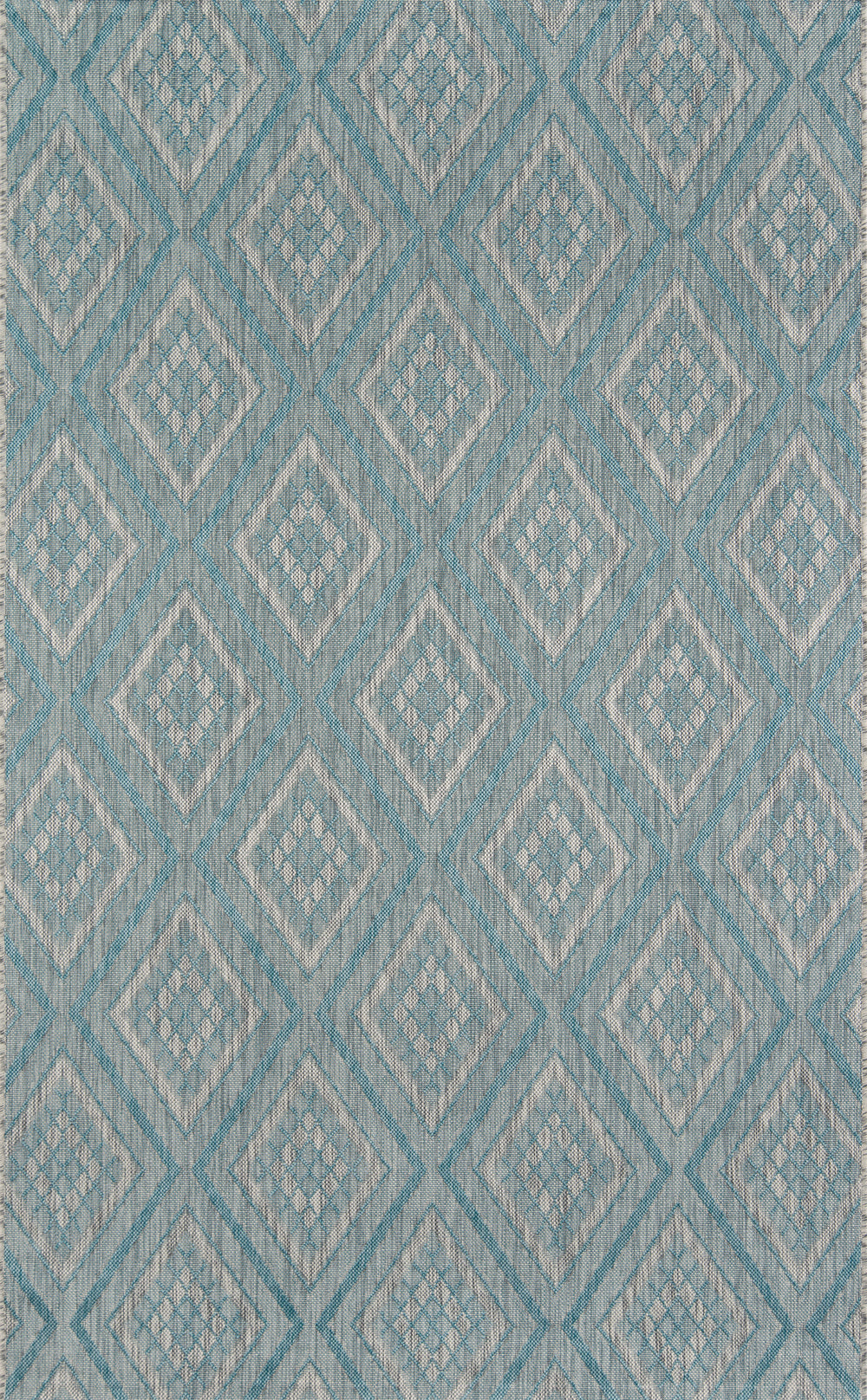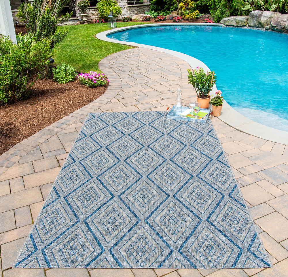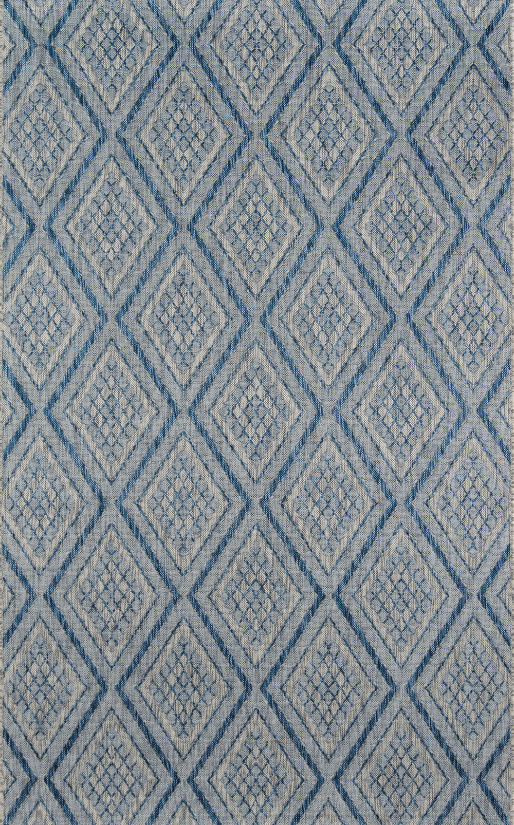 Weatherproof and wildly chic, this indoor/outdoor area rug is interior elegance outfitted for the backyard. The geometric trellis design is based on concentric diamond patterns that cover every inch of the rectangular rug format in repeating blue and white lozenges. Low maintenance polypropylene fibers clean with a quick rinse from a hose, making this all-weather floorcovering ideal underfoot during outdoor entertaining. Designed exclusively for the Madcap Cottage by Momeni collection, this UV-resistant rug keeps every room looking lovely in rain or shine. Bring the adventure home.