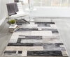 A collage of rectangles and squares form the contemporary patchwork this transitional area rug design that plays with shape and scale. Contemplative swatches of color defy convention as merging rectilinear shapes collide in shades of charcoal gray, ivory, black and beige. Innovative manufacturing techniques replicate the artisanal quality of handmade area rugs using modern machinery, deftly weaving the decorative floorcovering from synthetic fibers that are outstanding under daily wear.
