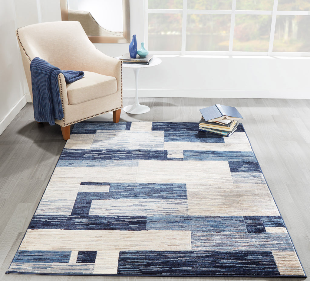 Shake up a sitting room or sleeping space with the abstract style of this transitional area rug collection. Each compelling rug design boasts contemporary characteristics, placing rectangular patchwork and graphic geometric patterns beside painterly striations and stripes. Captured in black, beige and dark blue tones, each decorative floorcovering is a delightfully unexpected element for interiors with an appreciation for the interpretive.