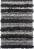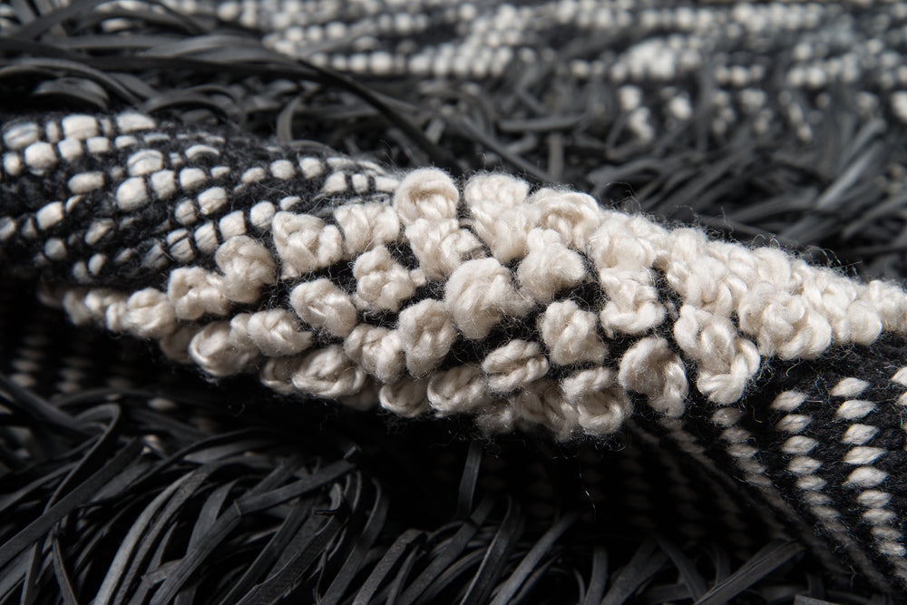 Graphic stripes define the striking design of this all-weather area rug, creating a bold accent on interior and exterior floors everywhere. Rows of knotted white diamonds and a bold black and grey color palette speaks to the patio rug’s tribal aesthetic, pairing tone with texture to create utterly touchable results. As wisps of fringe accentuate the weather-resistant worldly vibe, the mixed media rug format uses resilient rubber and PET fibers to develop depth and dimension throughout the handmade floorcovering.