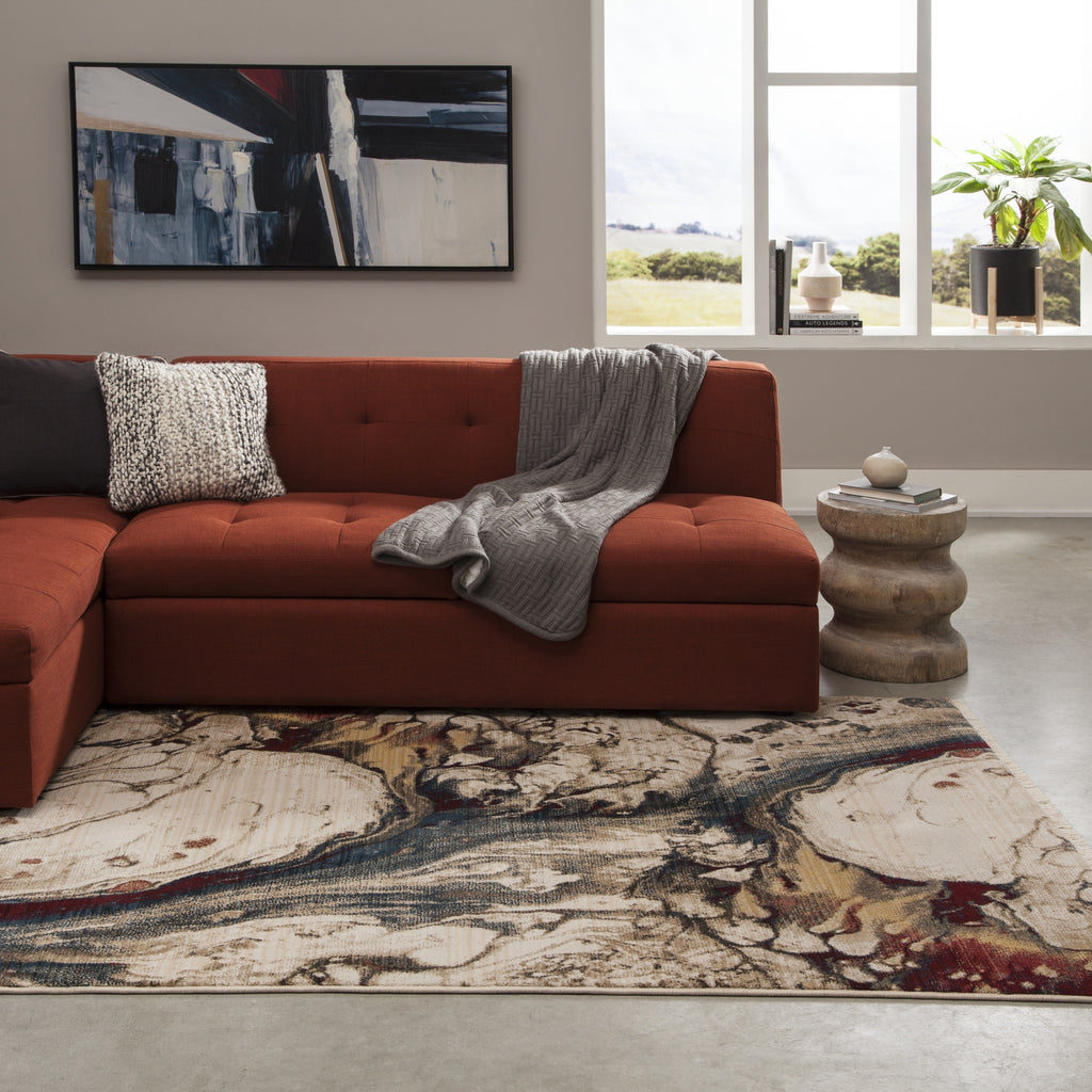 Swirling gestures shape the sleek, sophisticated style of this modern rug. Inspired by the separation between oil and water, the undulating movement of the abstract pattern flows across the rectangular rug field, as red, black and blue tendrils curl around the beige background. Woven polypropylene construction makes this decorative floorcovering elegant enough for formal spaces but durable enough for everyday areas.
