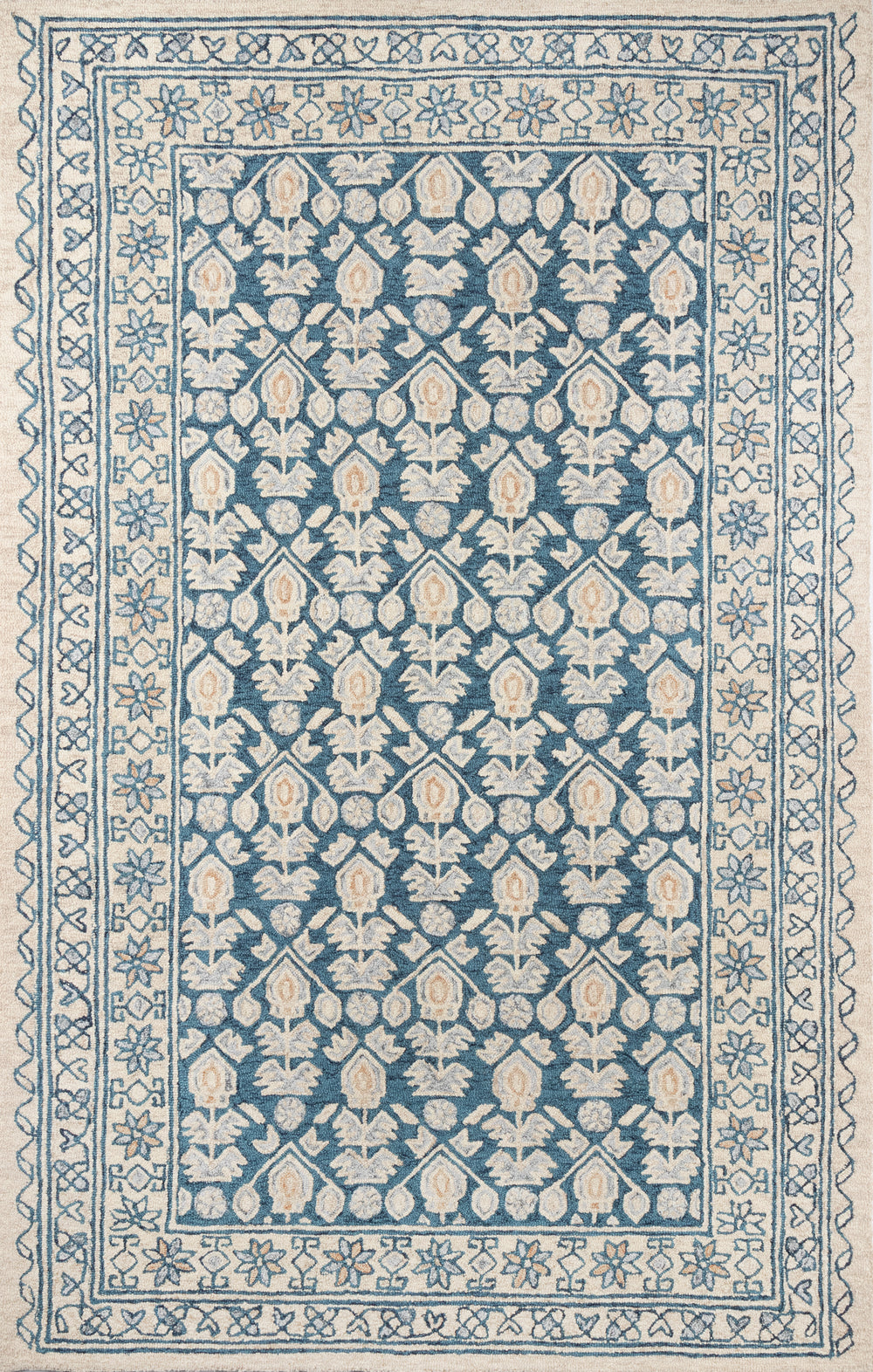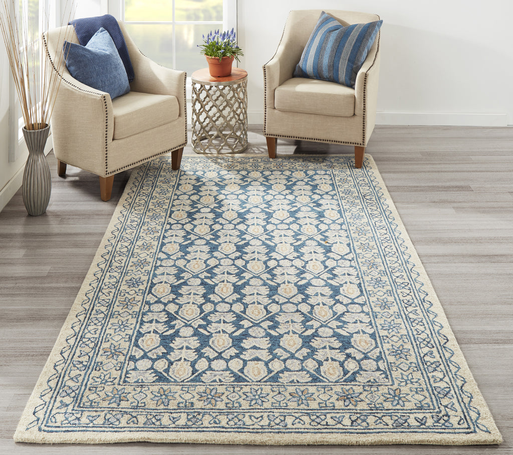Embrace the intricacy of this blue patterned rug, its subtle floral shapes in a range of blues would complement any dining room. Create contrast by adding white accents like a high gloss dining table and touches of camel-colored chairs and decor. Handmade from wool, it’s naturally more durable to spills and wear too.