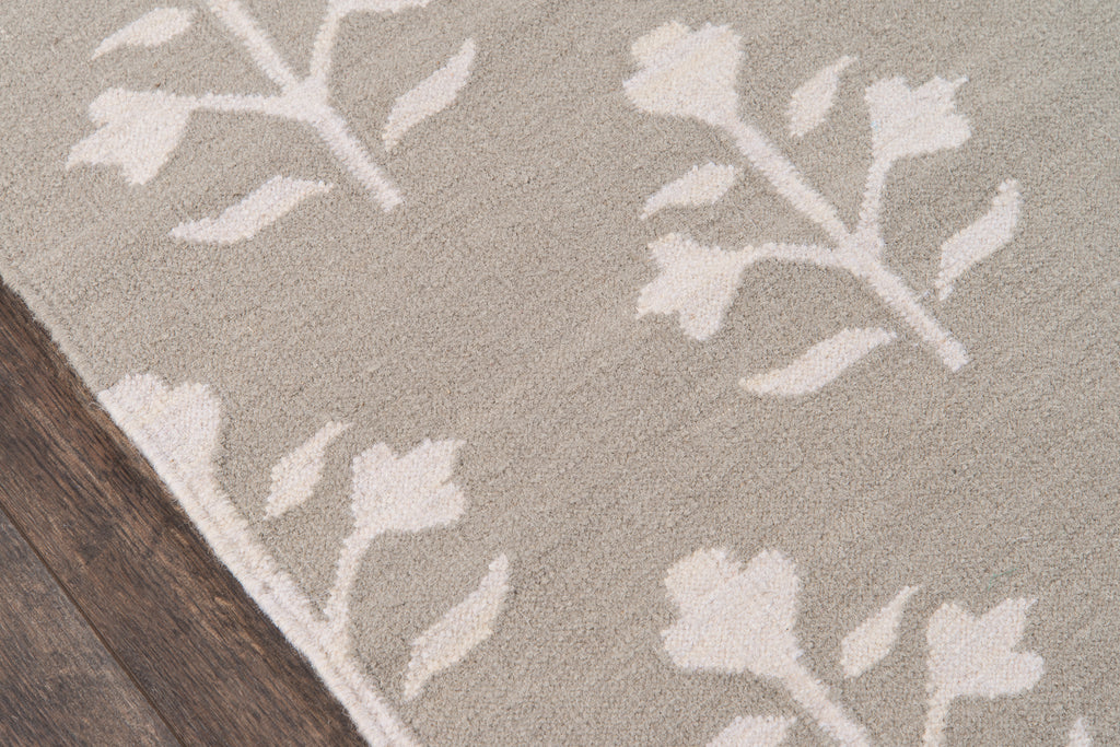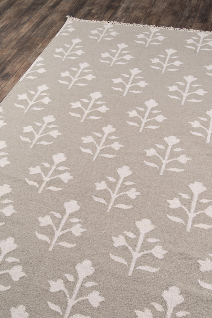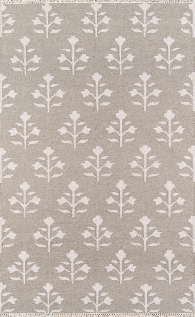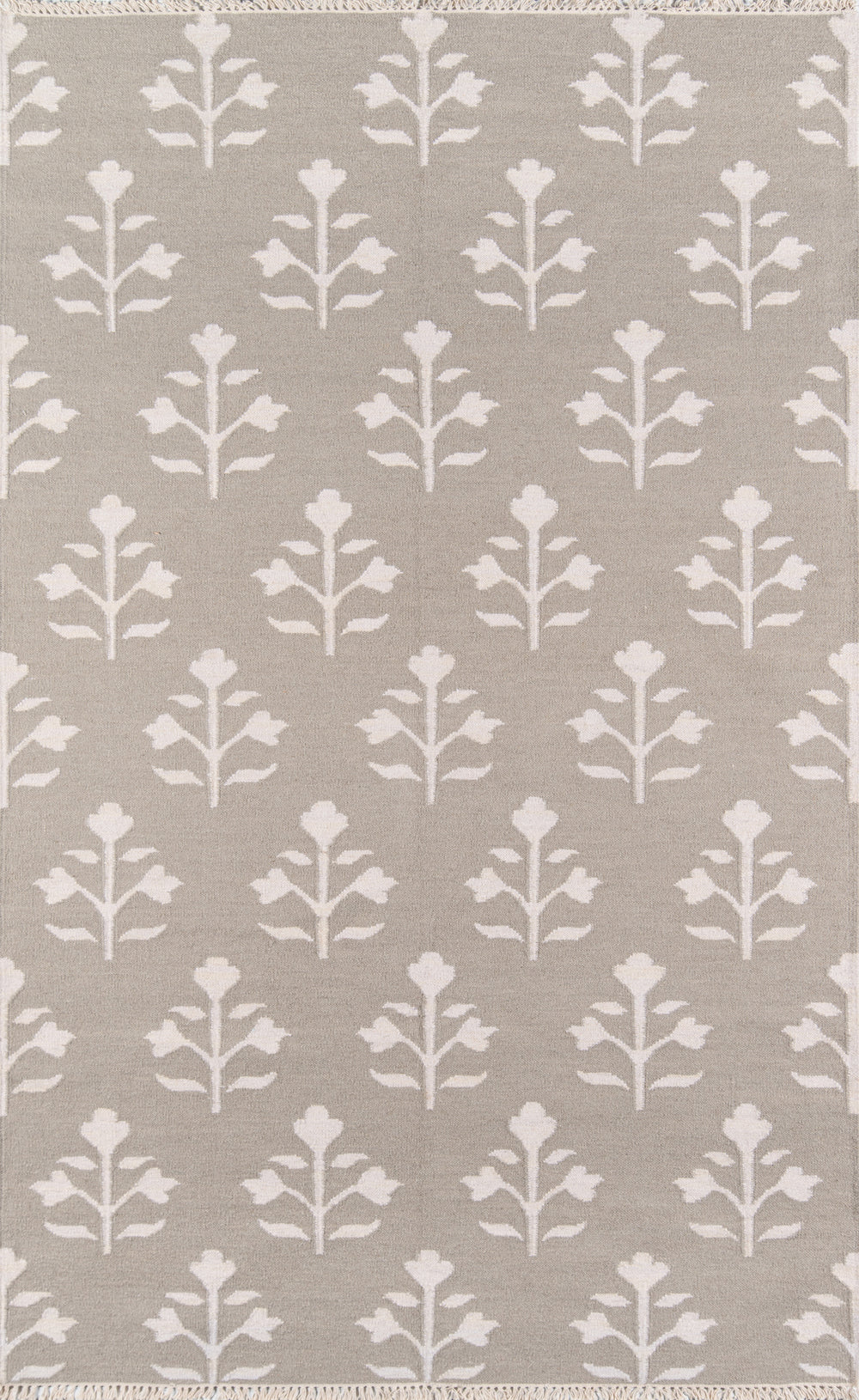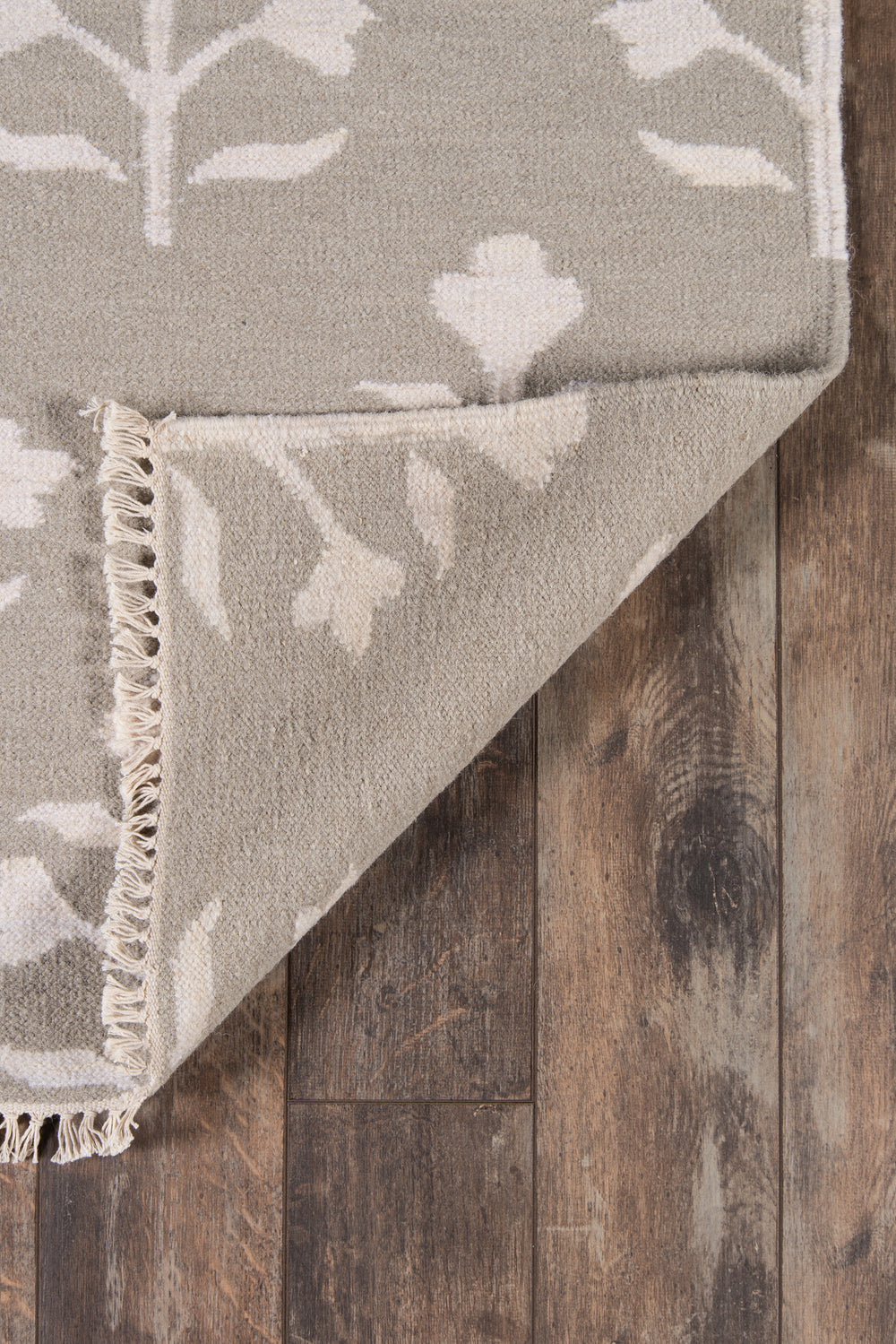 The silhouette of a small shrub serves as design inspiration for the topiary print of this indoor area rug. A traditional symbol of life and vitality, white flower-and-leaf motifs flourish across the grey rug field to create a botanical pattern worthy of walking upon. Natural wool fibers hold up beautifully under heavy floor traffic while hand woven craftsmanship adds a true artisanal touch to this decorative floorcovering.