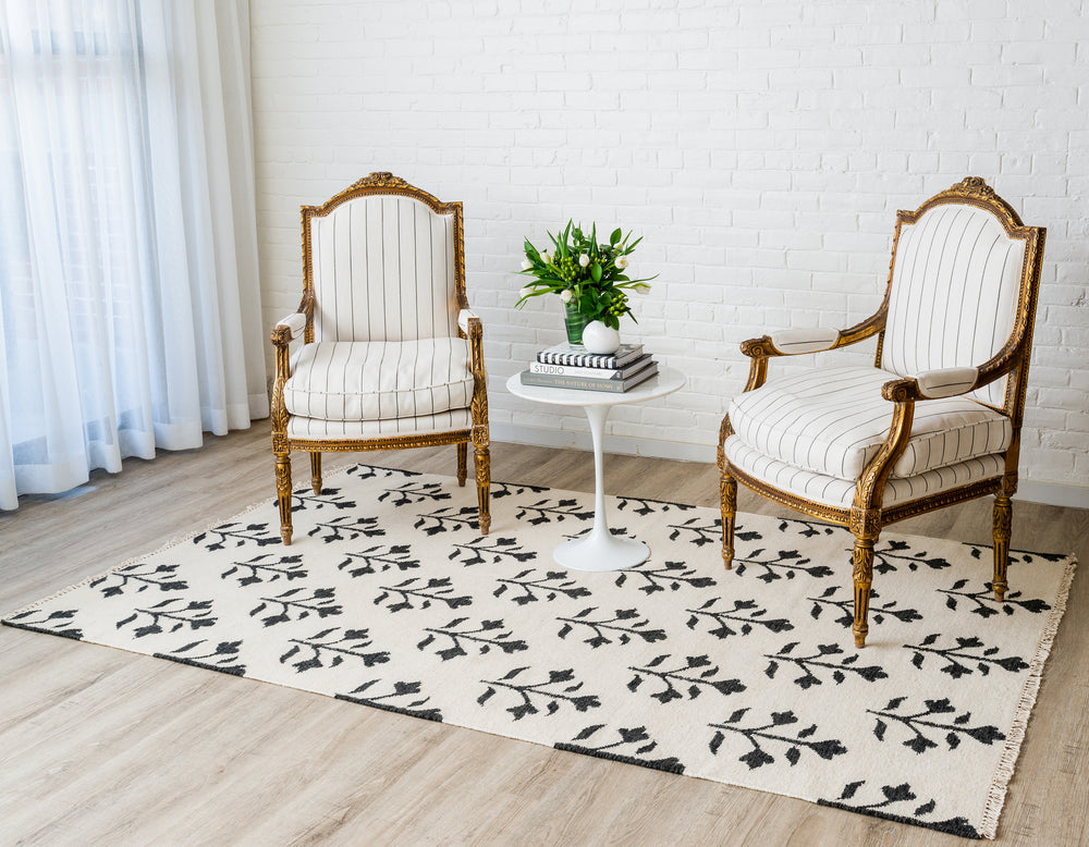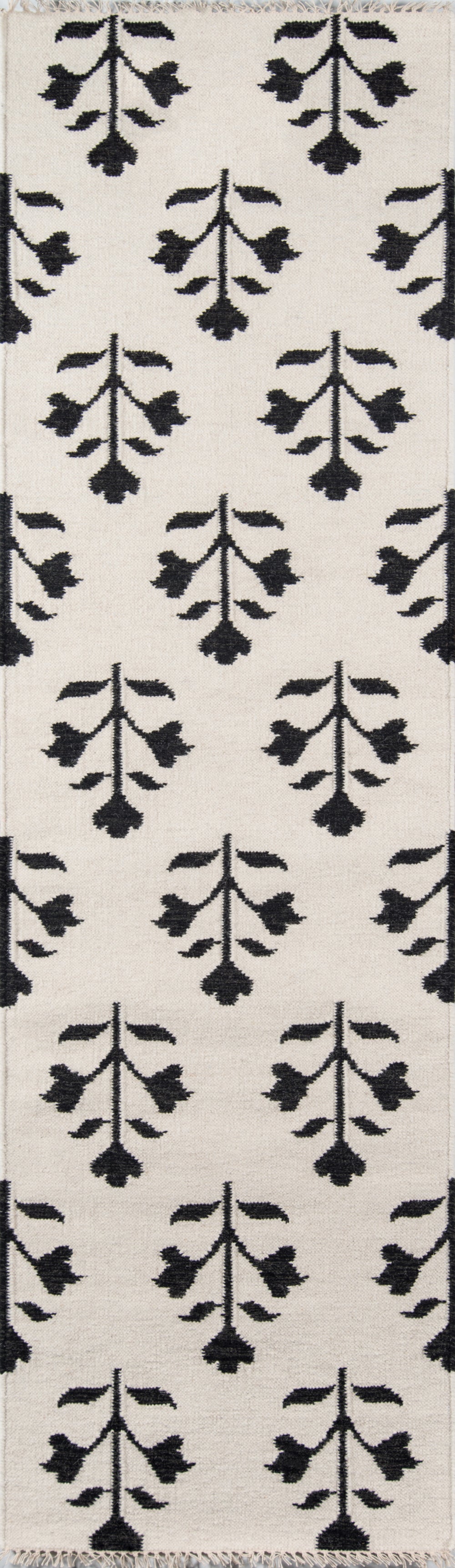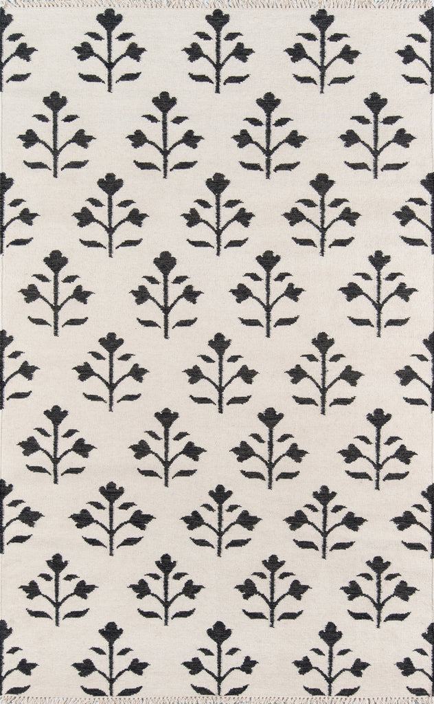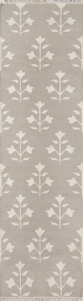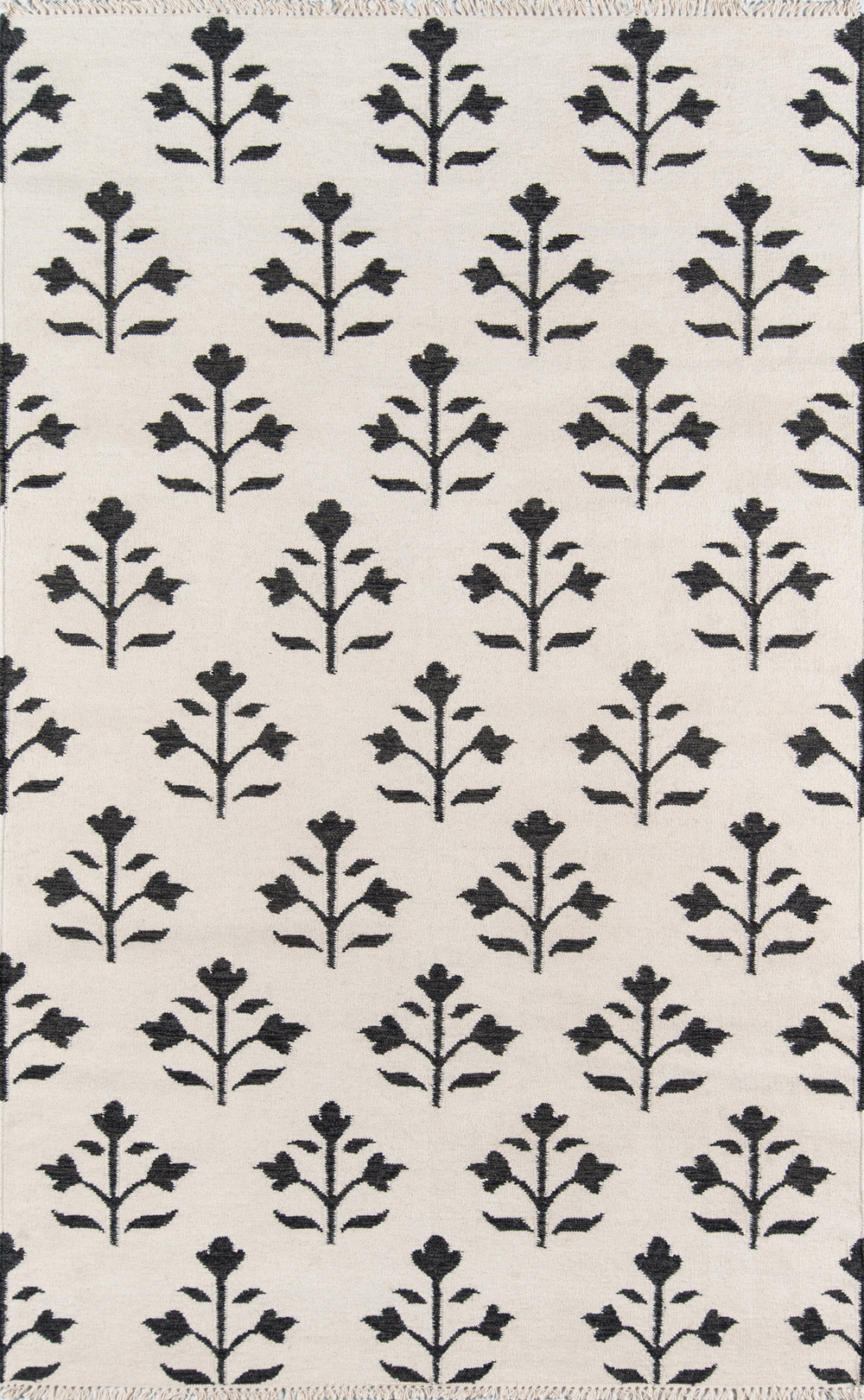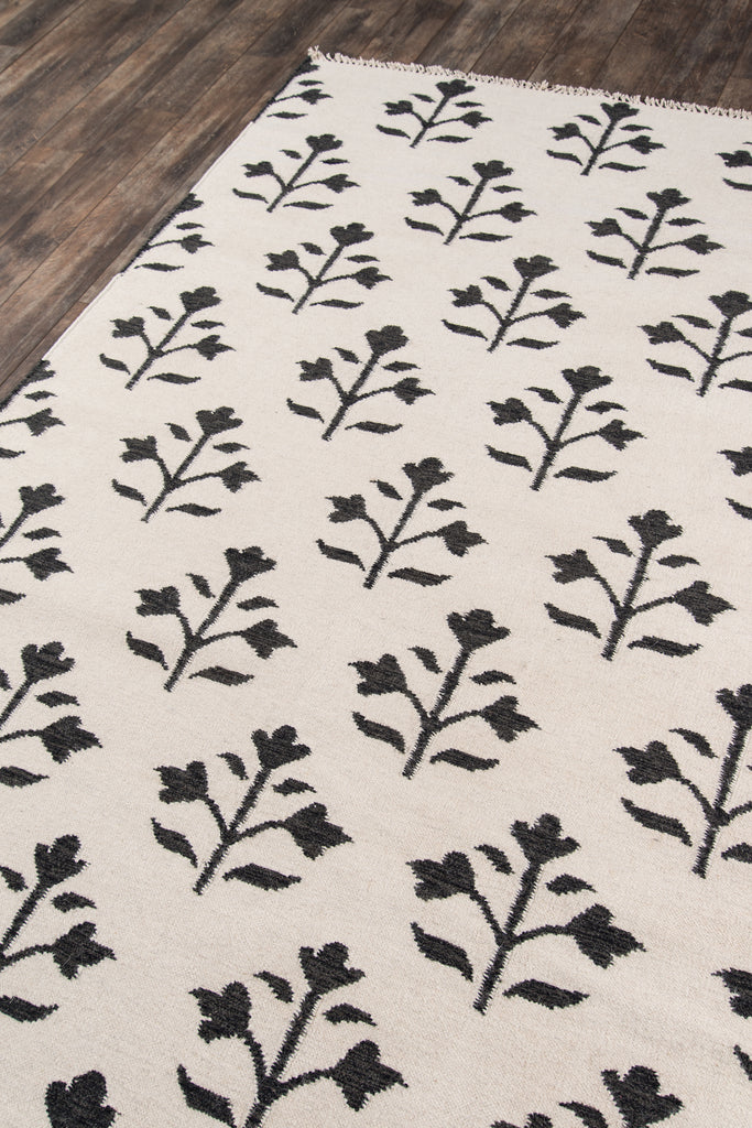 The silhouette of a small shrub serves as design inspiration for the topiary print of this indoor area rug. A traditional symbol of life and vitality, white flower-and-leaf motifs flourish across the grey rug field to create a botanical pattern worthy of walking upon. Natural wool fibers hold up beautifully under heavy floor traffic while hand woven craftsmanship adds a true artisanal touch to this decorative floorcovering.