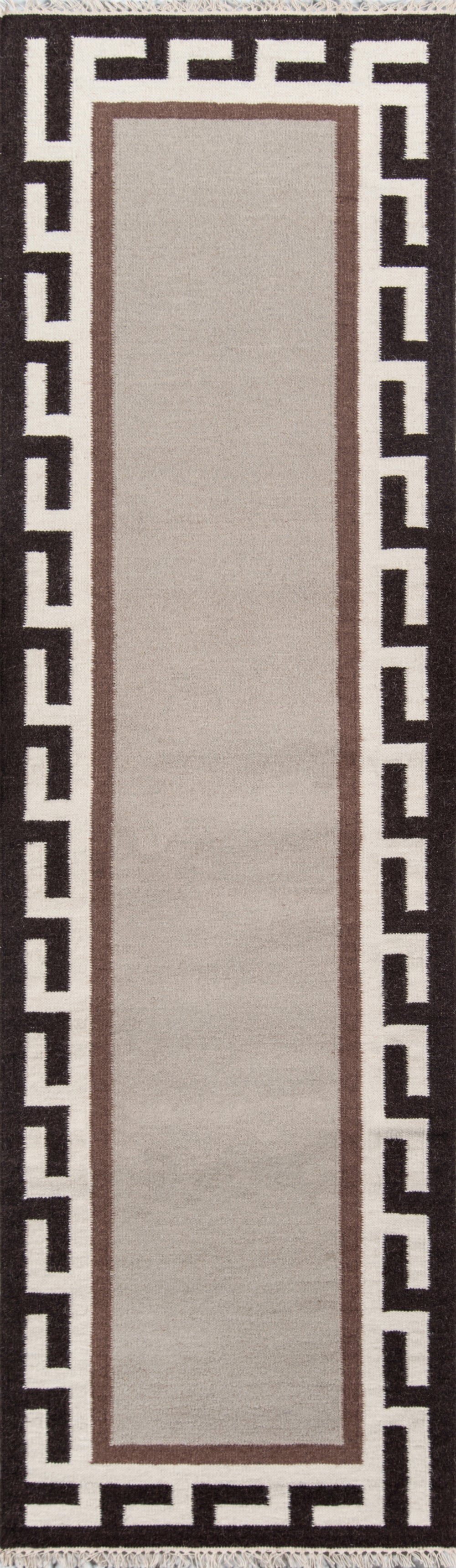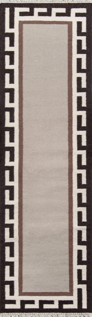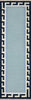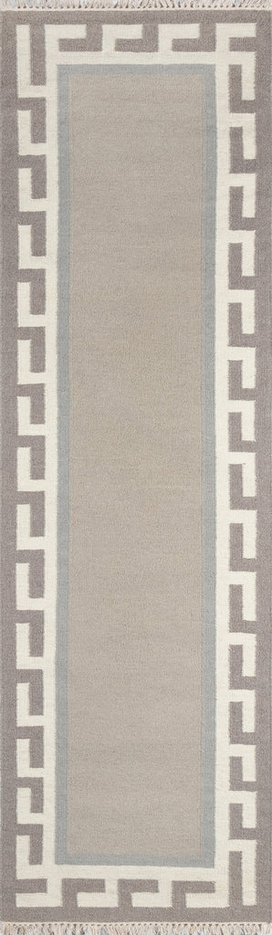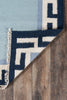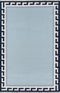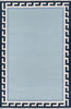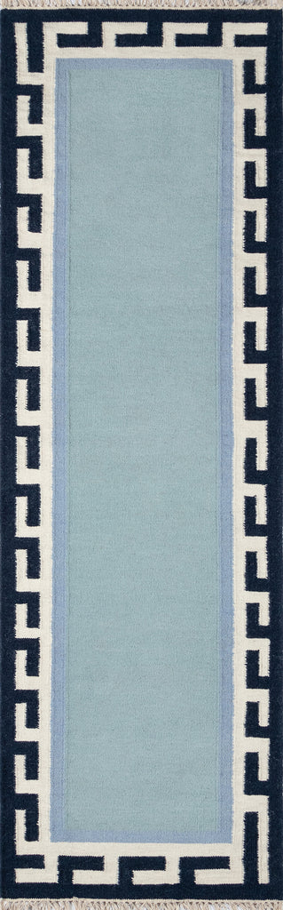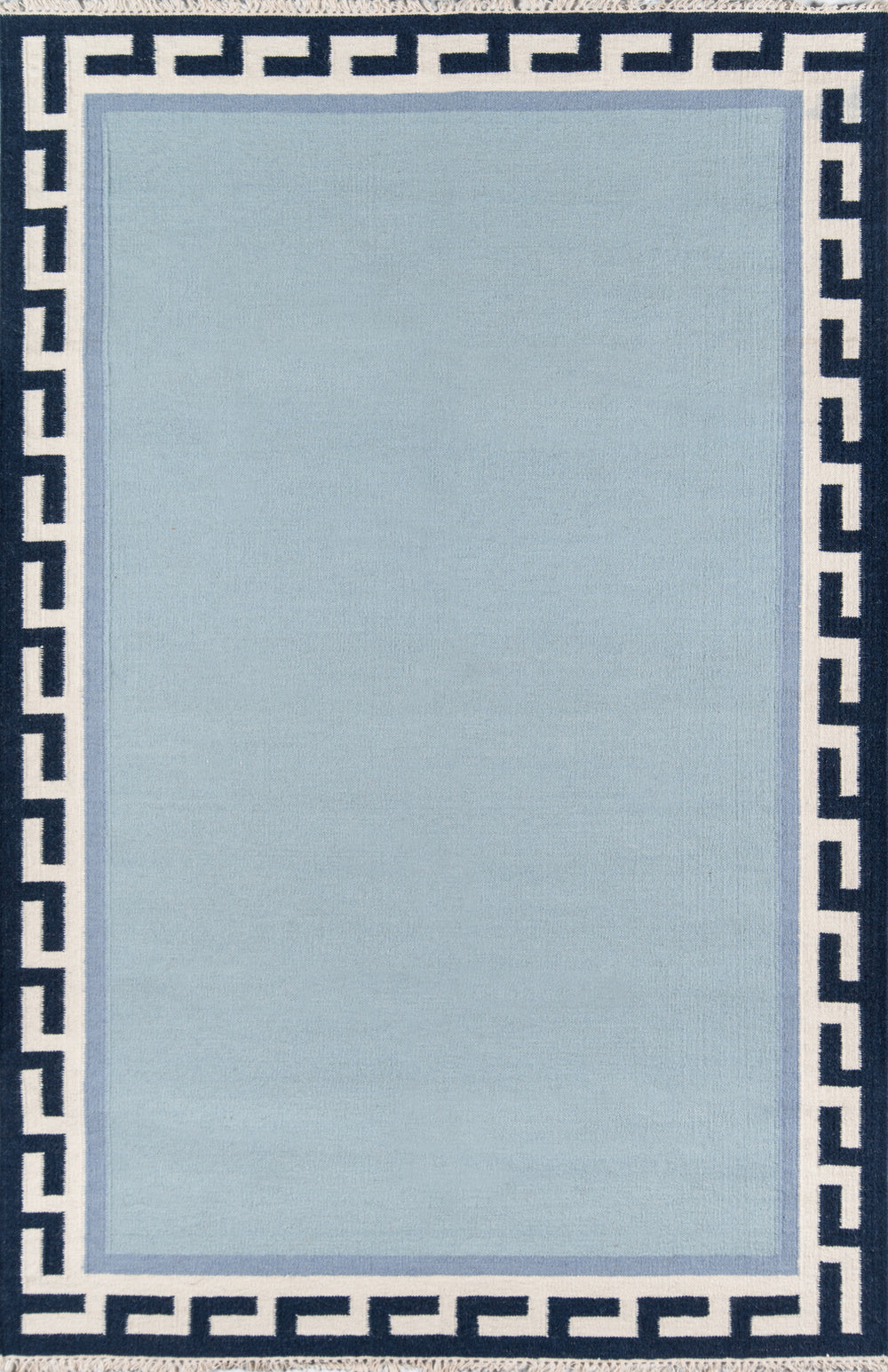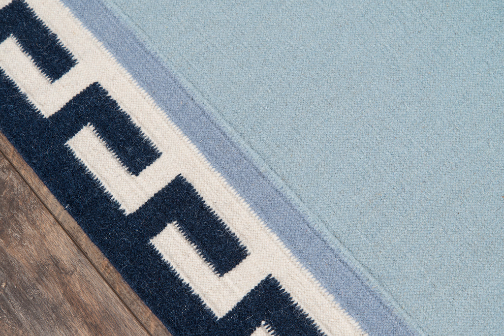 The tribal outline of this traditional area rug makes it an ideal interior accent to highlight a coffee table or couch. A solid sky blue field grounds a graphic navy blue and ivory border that surrounds the rectangular rug in angular L-shaped motifs. Natural wool fibers hold up beautifully under heavy floor traffic while hand woven craftsmanship adds a true artisanal touch to this decorative floorcovering.