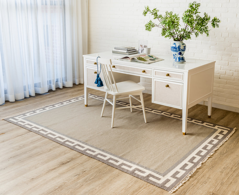 Timeless hand woven carpet techniques enhance the artisanal quality of this decorative area rug. Captured in colors ranging from pastel pink and ivory to denim blue and dove gray, fringed edges feel utterly bohemian beside bold geometric patterns and tribal motifs. Renown for its superior wear and stain resistance, 100% natural wool fibers make each decorative floorcovering a true statement piece with sustainable beauty.