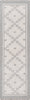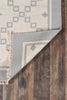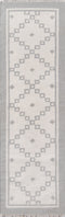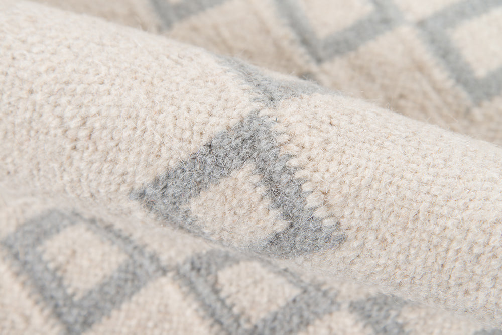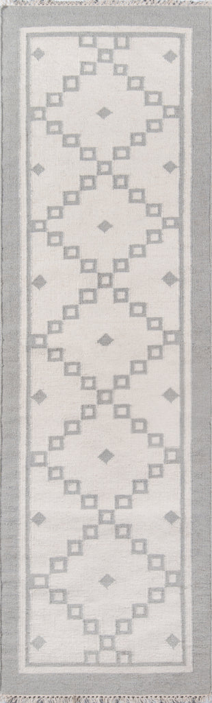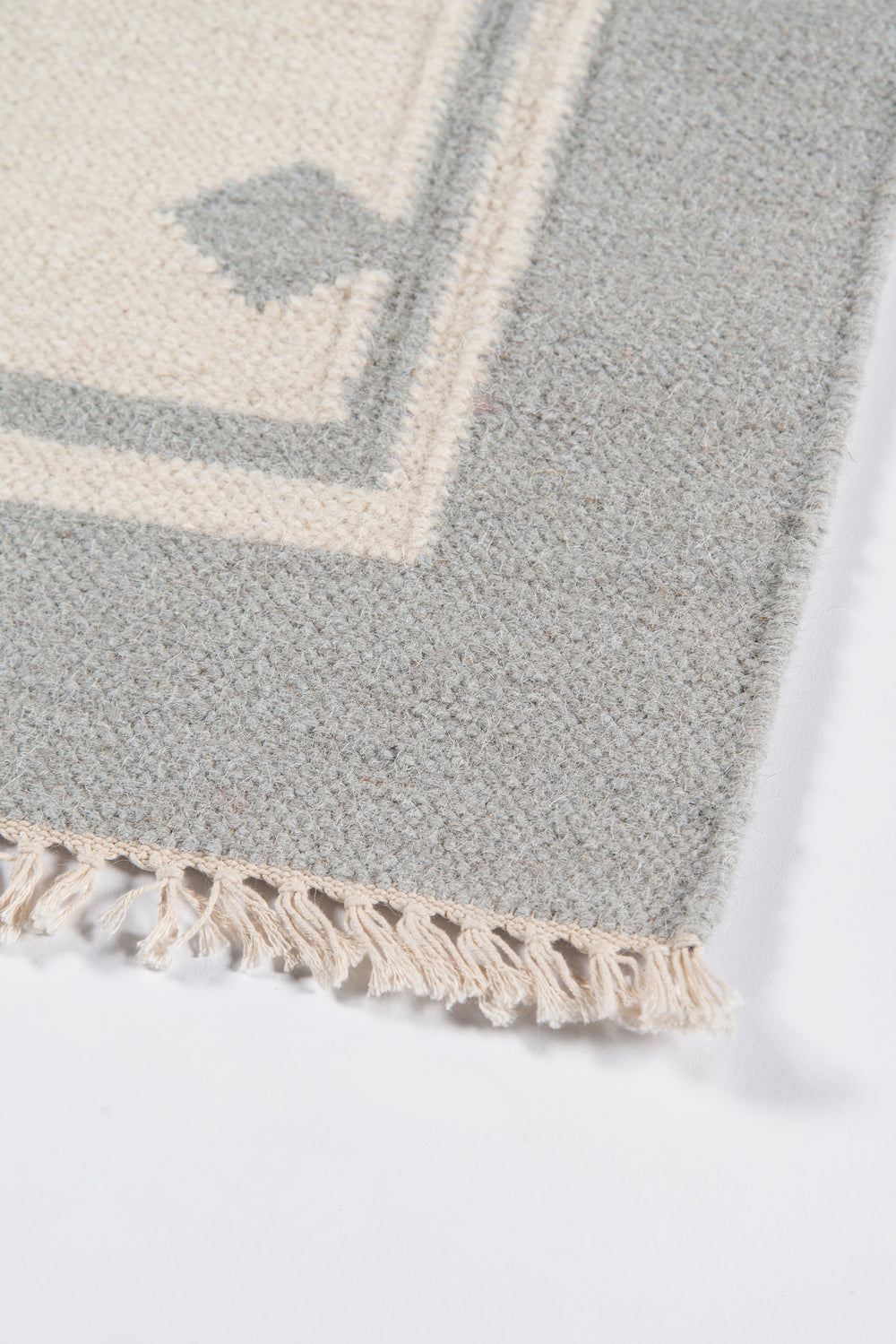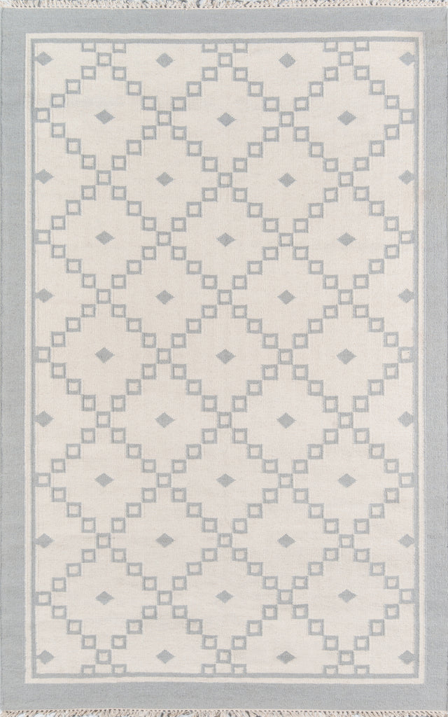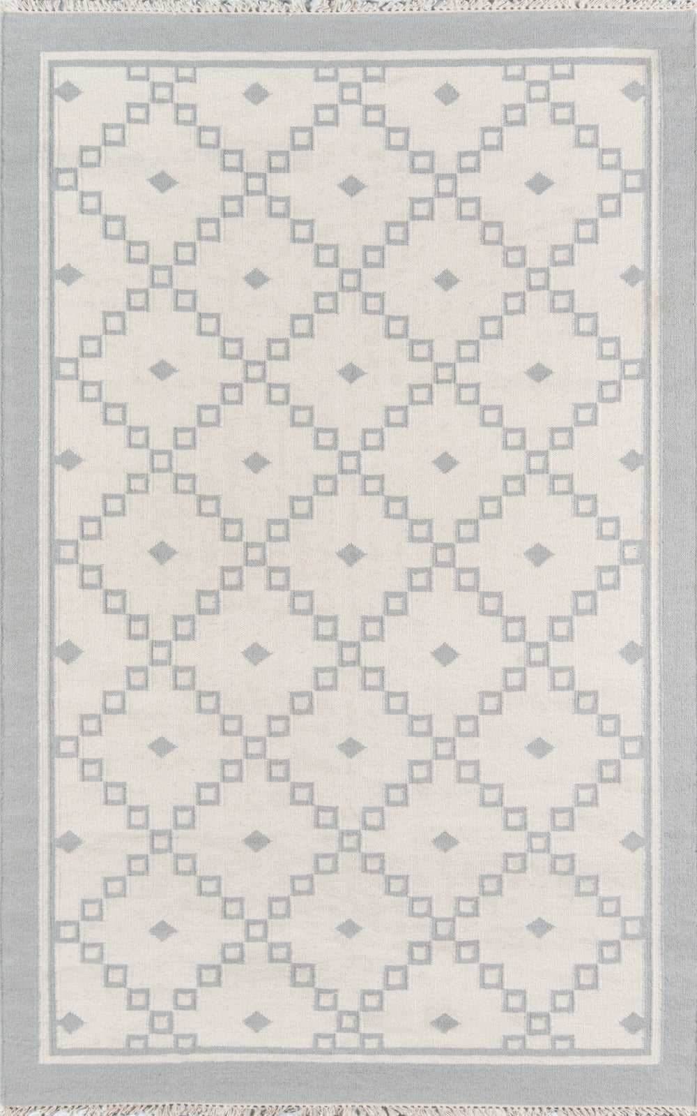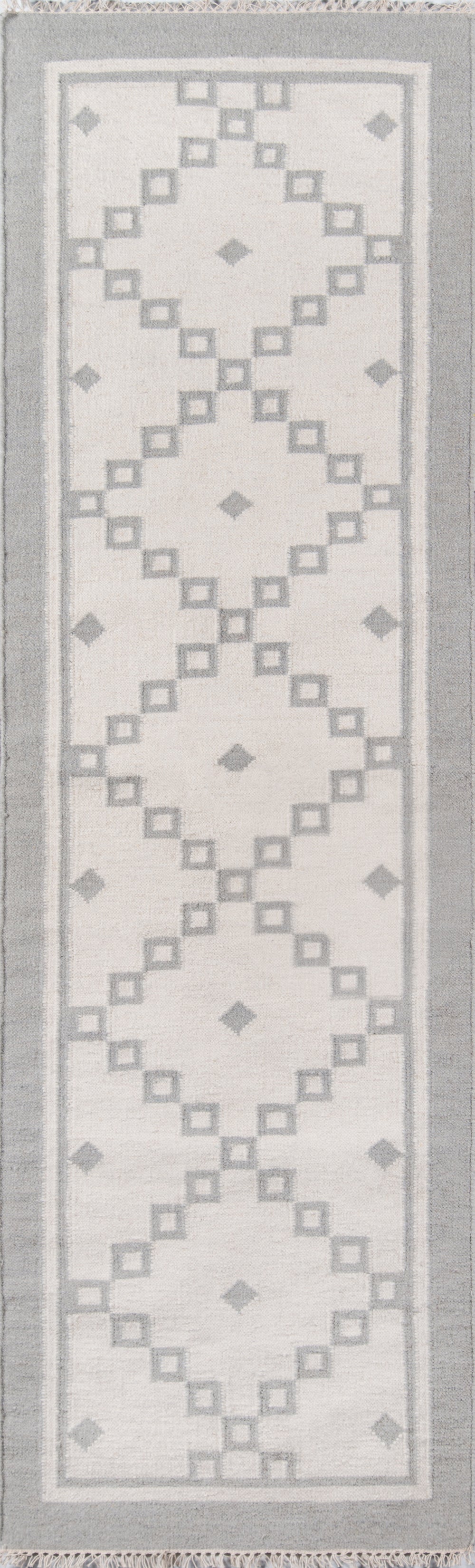 The eclectic style of this exotic area rug softens traditional rooms with its muted grey tones. Surrounded by a solid border and finished with a swish of tasseled fringe, the tribal rug design uses a series of squares to create the open framework of a geometric trellis pattern. Natural wool fibers hold up beautifully under heavy floor traffic while hand woven craftsmanship adds a true artisanal touch to this decorative floorcovering.