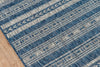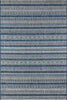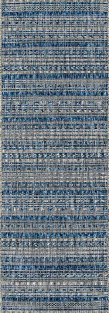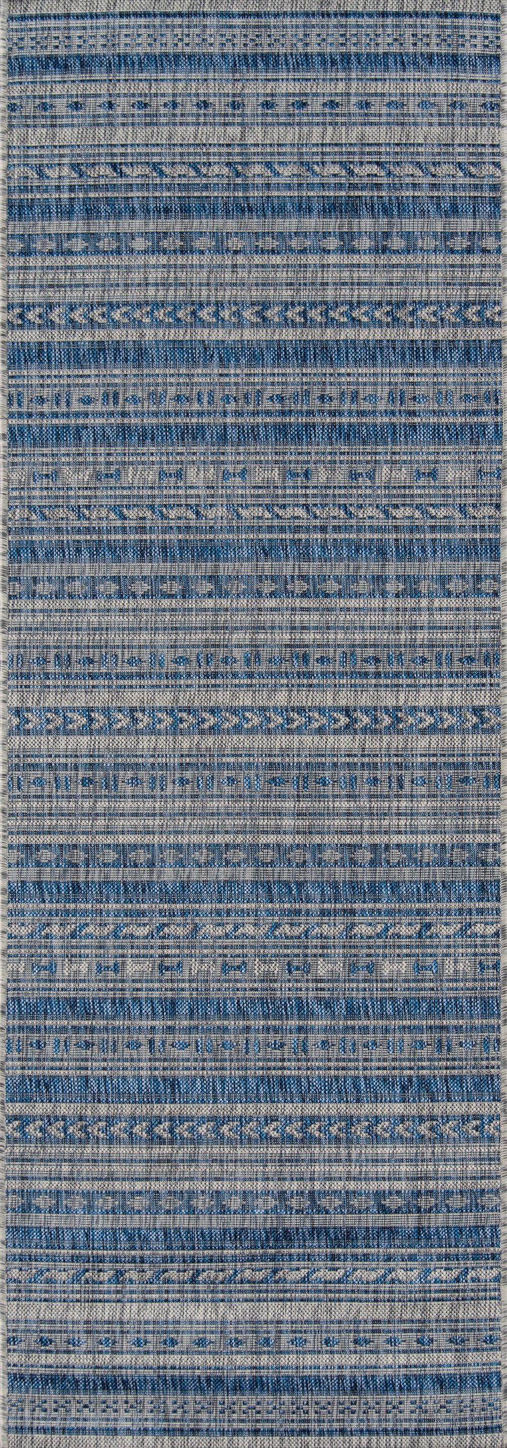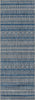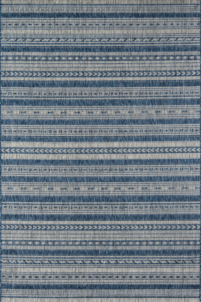 Inspired by the intricate decoration of Italian textile prints, this indoor/outdoor area rug features an all-over pattern that truly goes everywhere. The blue-and-white striped rug plays with geometric shapes and exotic tribal motifs, each row varying in ornamental embellishment as it adorns interior and exterior floors. Resilient polypropylene fibers are stain, heat and UV-resistant, retaining their color and texture throughout consistent exposure to the elements.