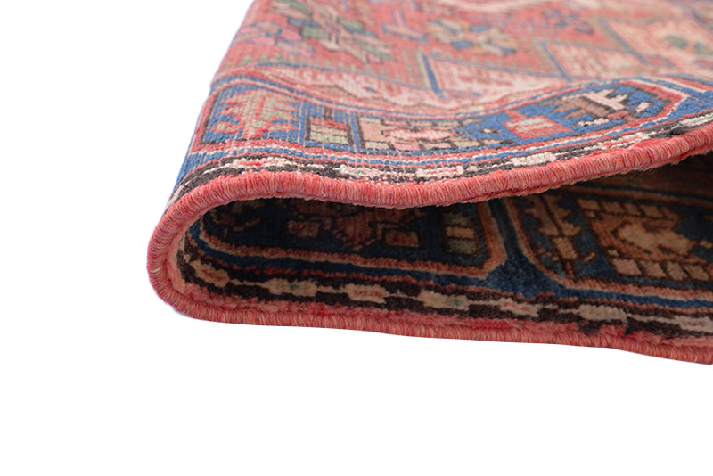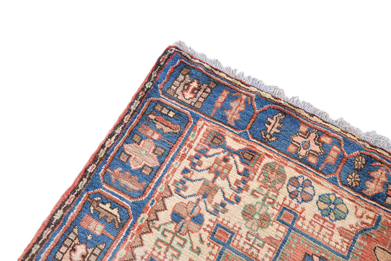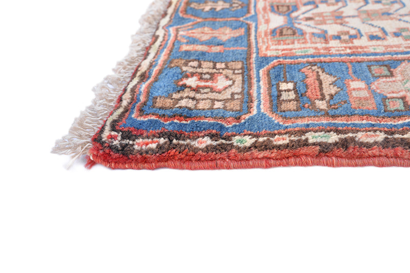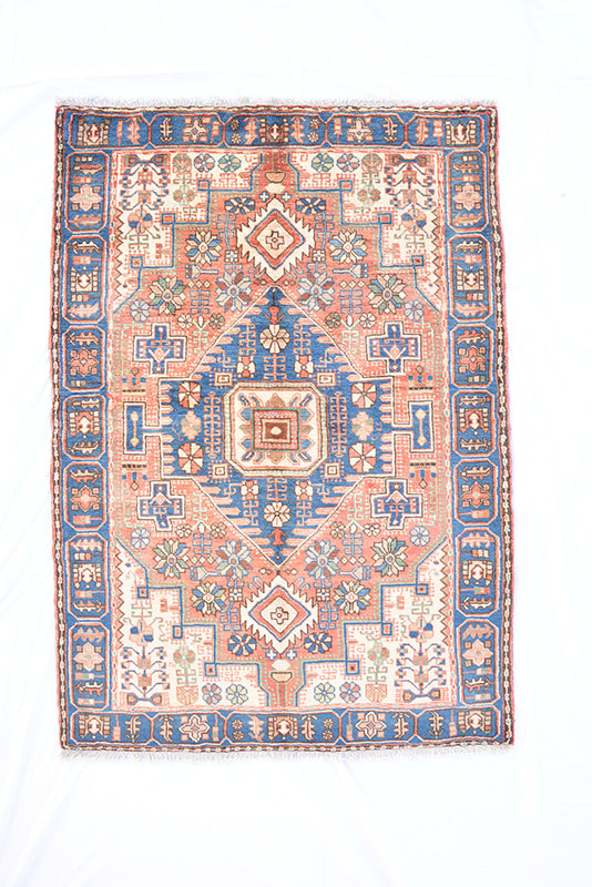 Augment the look of your with this splendid blue bordered Persian rug made out of wool and cotton, which includes a noticeable softness and sheen, and encapsulates central medallion with unique motifs. Nahawan rugs are known for its Persian pattern of nomadic and geometric motifs, with medallion in the middle, measures 4'5"x6'3", designed with prominent red, beige, and blue, which makes the rug all the more unique. Nahawan rugs are most sought after for its durability, high quality of wool on a cotton foundation, dominating colors for its richness to differentiate it from all other furniture and interiors in your home. On the whole, the distinctive medallion colors and curvilinear designs used in this Persian tribal rug make it an ideal choice for your living room.