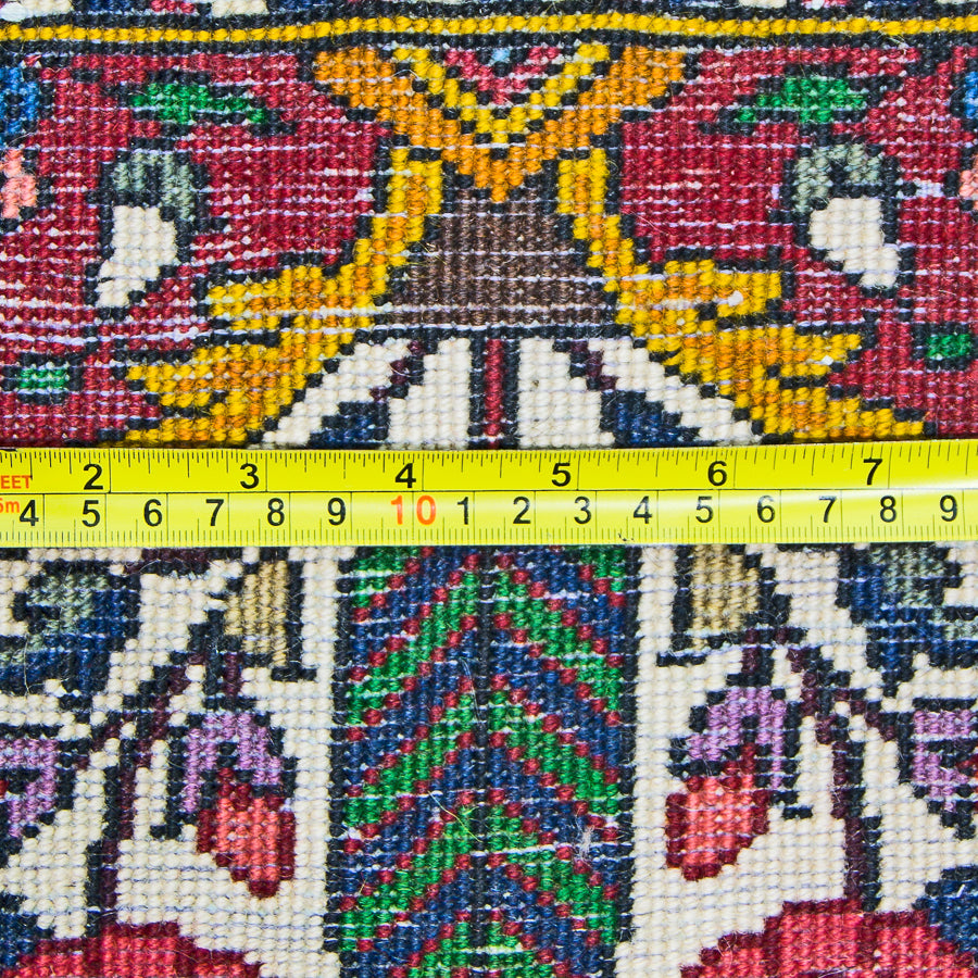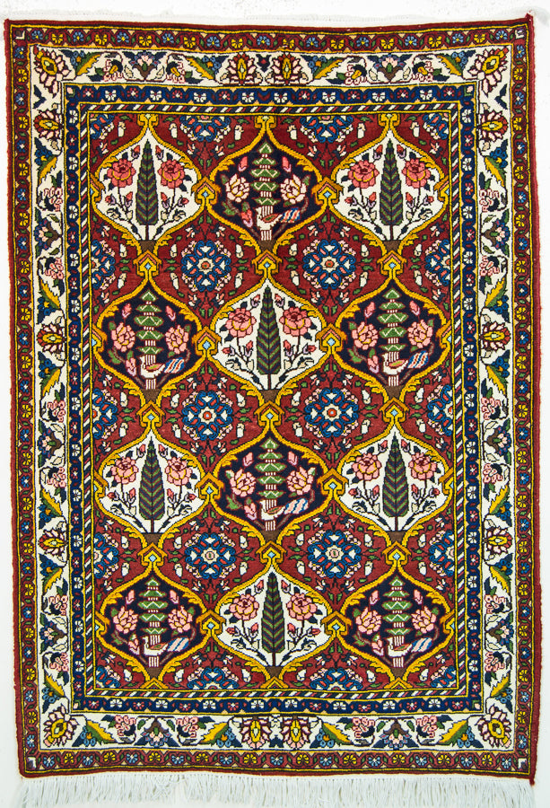 Bring a delightful outdoor scene into your home with this authentic Persian rug. Ornaments trimmed with gold create inviting scenes to explore across the rug. You'll find a variety of images from green trees to luxurious fountains. Rows of floral motifs frame the ornamental scene to complete the look. The traditional color combination of dark reds and creams make this one easy to add to your home decor. Bakhtiari artisans hand-knotted this authentic Persian rug using traditional techniques. They used a combination of wool and cotton to create a balance between lasting durability and value. This pick is sure to be a new favorite in your home.