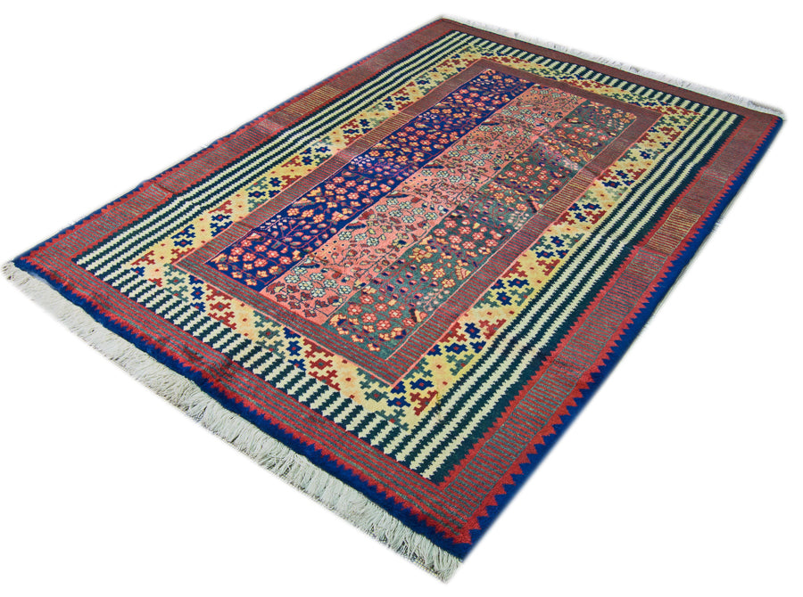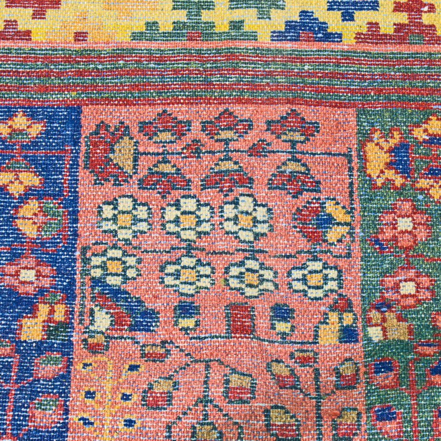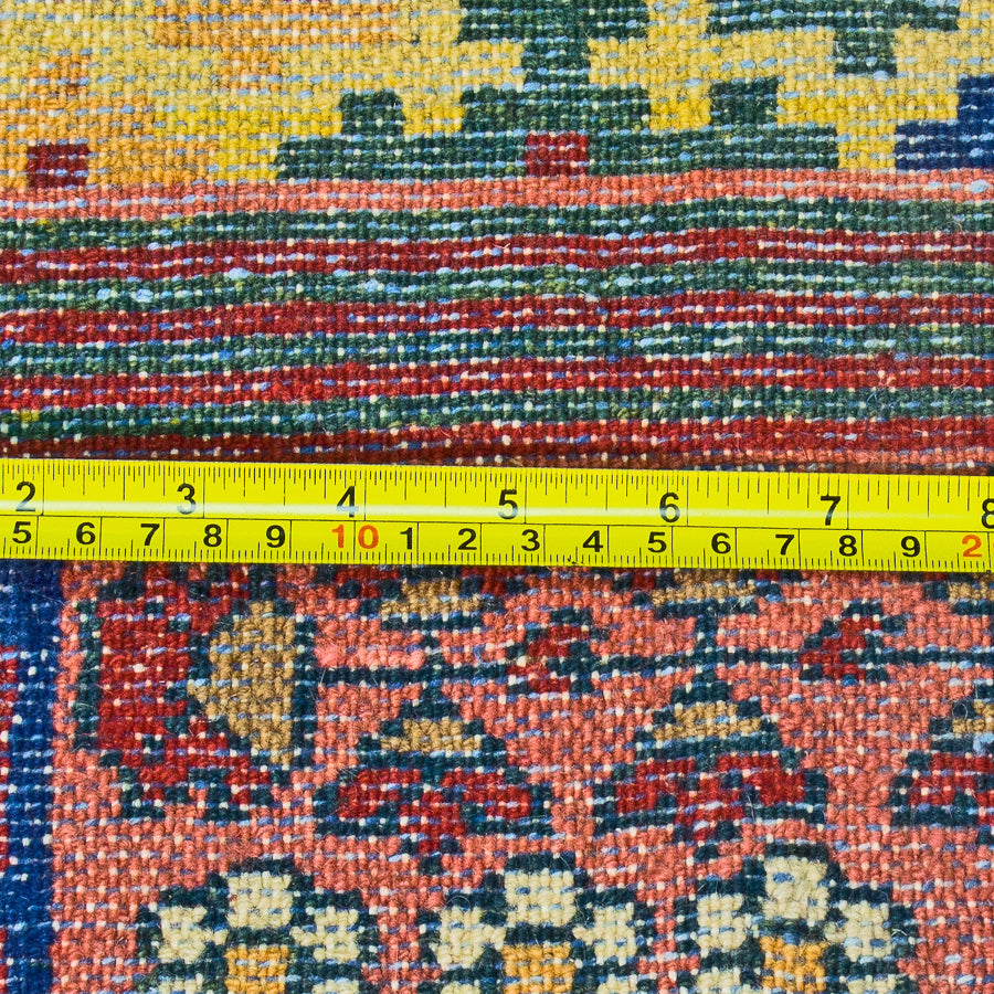 Enjoy the beauty of simplicity with this Bahktiary tribal rug. Long strips of floral motifs fill the center of the canvas. Four bords featuring contrasting simple tribal patterns add dimension to the simple design. The artisan used a vibrant blend of reds, blues, yellows, and pinks to inspire happiness in the owner. Place this beautiful floral rug in an open area of your home. Hand-knotted by talented tribal artisans, this authentic Persian rug brings traditional patterns and techniques into your home. The pure wool tufts ensure lasting durability in high-traffic areas. It's a functional work of art you'll enjoy for decades to come.