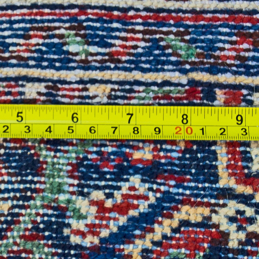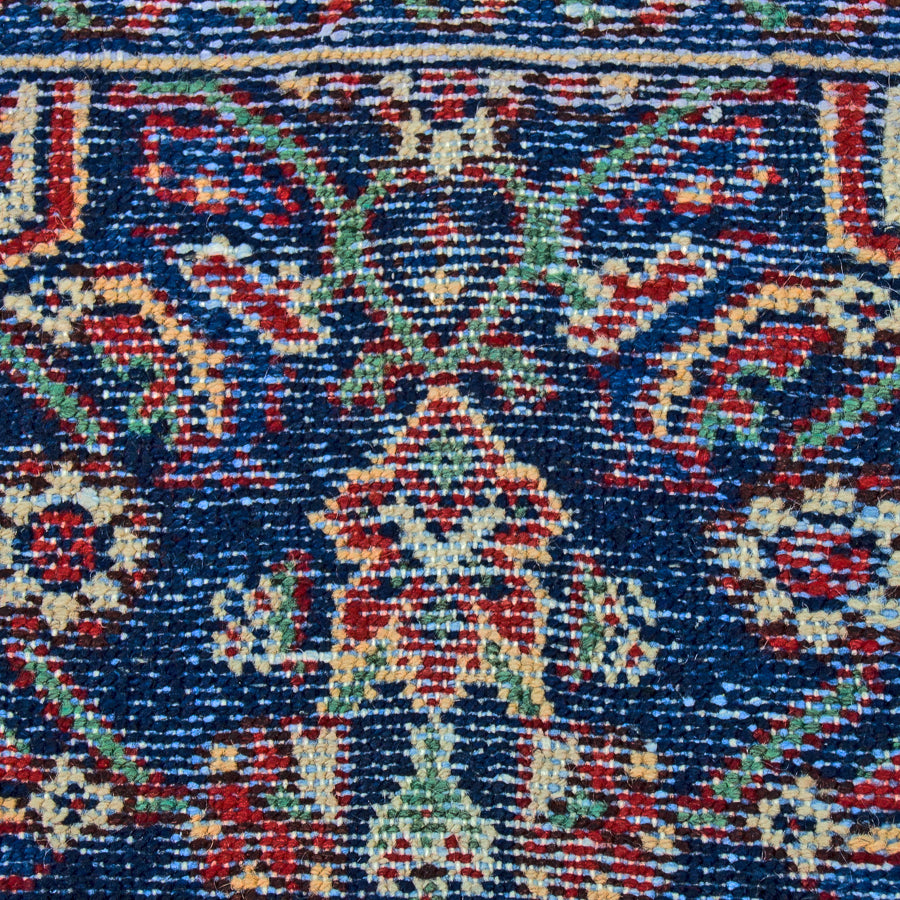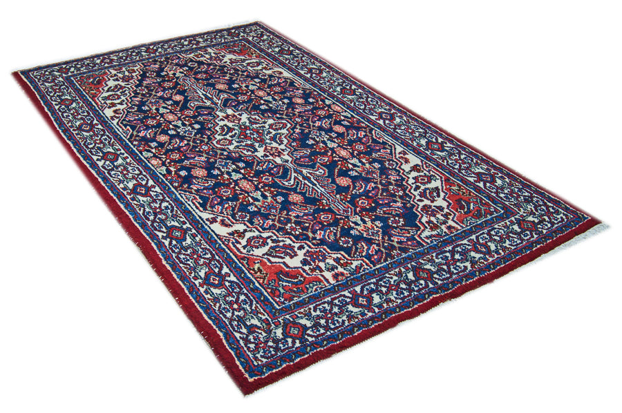 Add instant colorful design into your home with this traditional Hamadan rug. The ornate central area is bursting with beautiful floral motifs. The layers of detail allow you to find new things to love each time you look. The border frames the rug with large blooming flowers. This piece is easy to add to your decor with its tasteful combination of blue, red, and white. Hamadan artisans hand-knotted this authentic Persian rug using traditional techniques and patterns of the region. It's made with a wool and cotton blend to give you a balance between rugged durability and value.