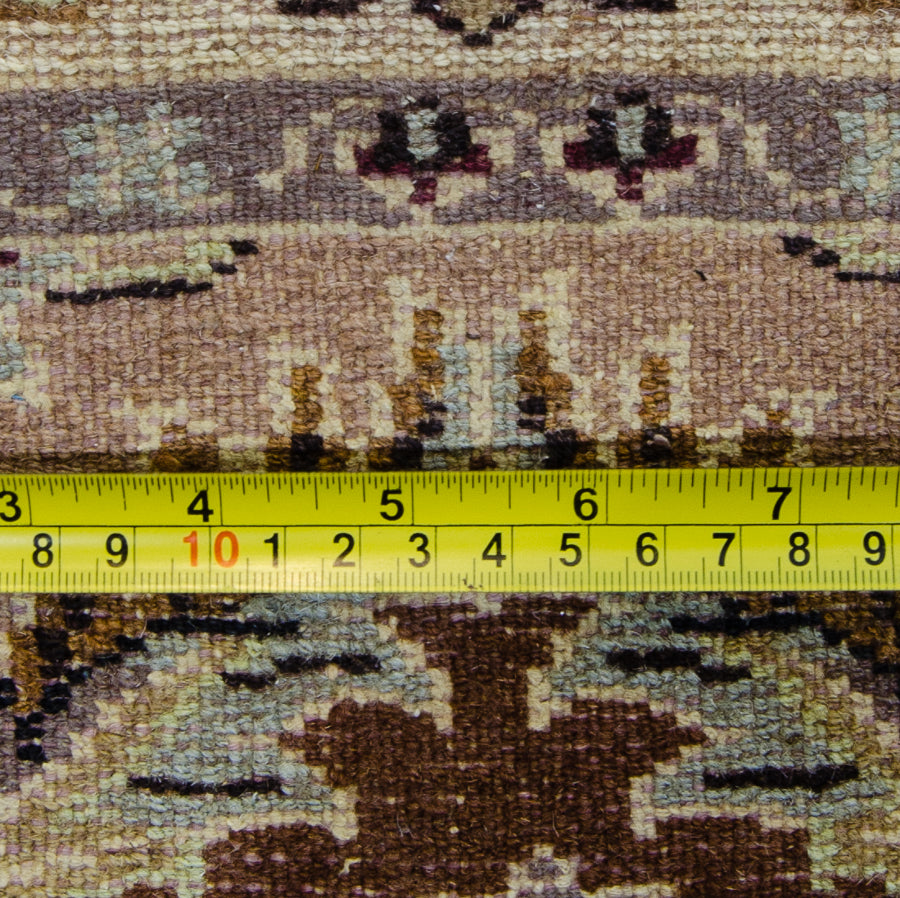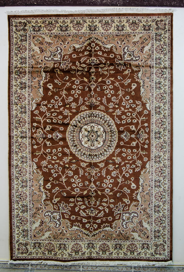 Enjoy the best of Karachi style with this authentic Oriental rug. A large circular medallion creates the center focus of the design. It's detailed with a kaleidoscopic effect. Romantic flourishes, flowers, and vines make this rug a beautifully detailed find. The border is complete with traditional Karachi motifs. This brown and tan rug is accented with bursts of red and green. Karachi artisans hand-knotted this Oriental rug using traditional methods of the region. It's made with a luxurious blend of silk, wool, and cotton. The silk and cotton add softness and vibrancy to the pattern. The wool guarantees this rug will last for years to come.
