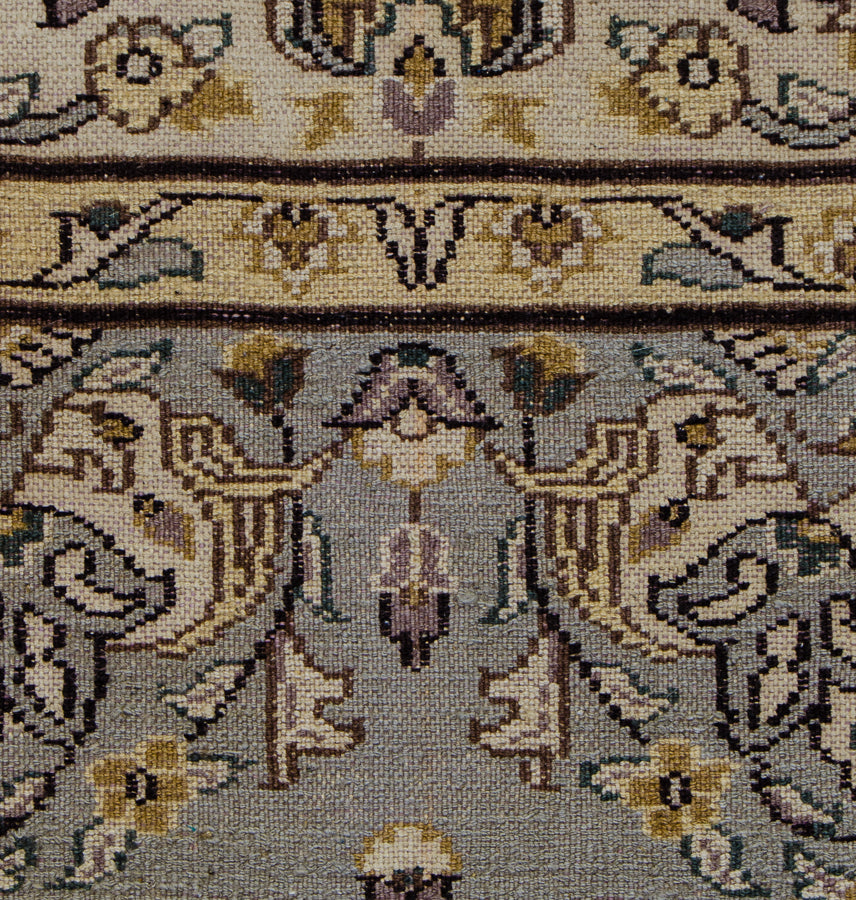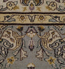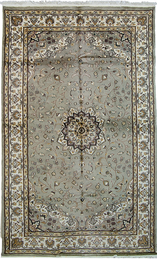 Take in the silk beauty and Karachi designs of this authentic Oriental rug. The large grey center features graceful flowers on long vines that sweep around the center medallion. The wide border reveals more flowery designs, so this is an ideal choice for fans of the natural world. This rug is grey, brown and tan, with pops of blue an yellow to add dimension and beauty. Karachi artisans hand-knotted this Oriental rug using the centuries of traditional methods of the region. The silk and wool combination allows the rug to be both extremely durable and touchably soft. The silk also adds that beautiful shimmering quality to the design.