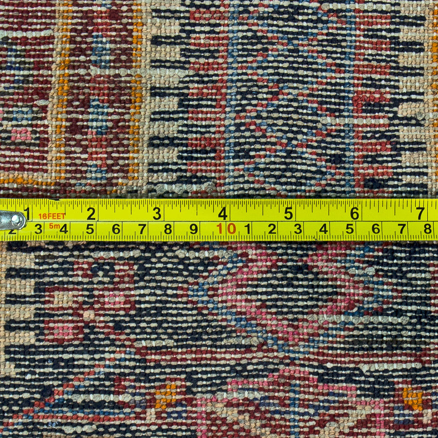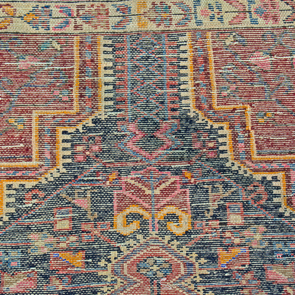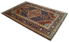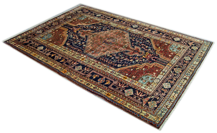 Have a look at the beautiful detail in this authentic Persian rug. True to Kashmiri patterns and colors, this rug features a large central medallion. It's detailed with arrows, flowers, and beautiful line work. It's dyed with a silky red color, which pops nicely against the deep blue background. The border reveals intricate diamond motifs and countless tiny details you'll savor each time you look. Pakistani artisans hand-knotted this rug using the traditional patterns and techniques of the region. It's made with a blend of wool and cotton to strike a balance between long-lasting durability and value.