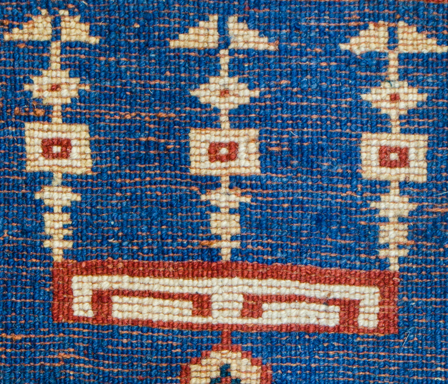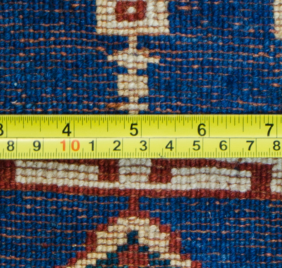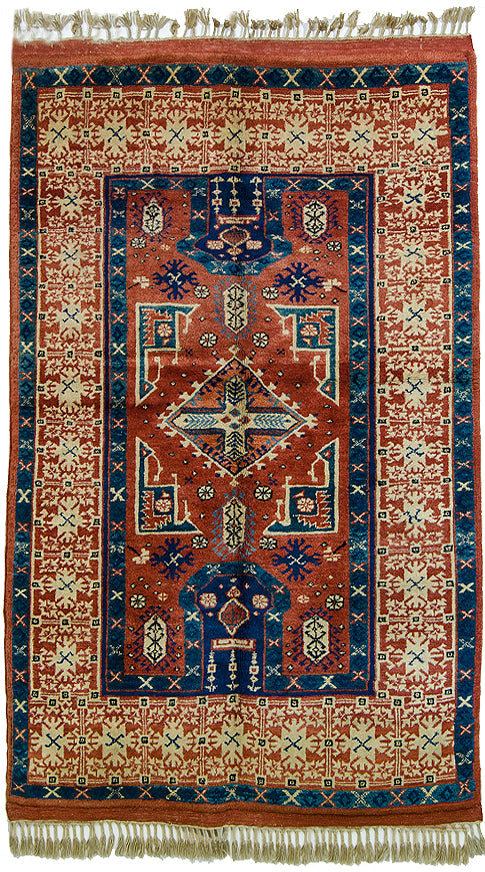 Say hello to authentic Turkish Kazak style in this classic Persian rug. This rug features traditional patterns and motifs of the centuries-old Turkish style. A large cross medallion sits in the middle and gives way to simple tribal patterns. The artisan used a beautiful blend of traditional blues, reds, and tans. This classic piece is a wonderful addition to your home decor. Kazak village artisans hand-knotted this authentic Persian rug to ensure it's made with the traditional methods, materials, and patterns. The wool material makes this rug durable, so you can use it in high-traffic areas.