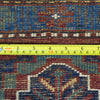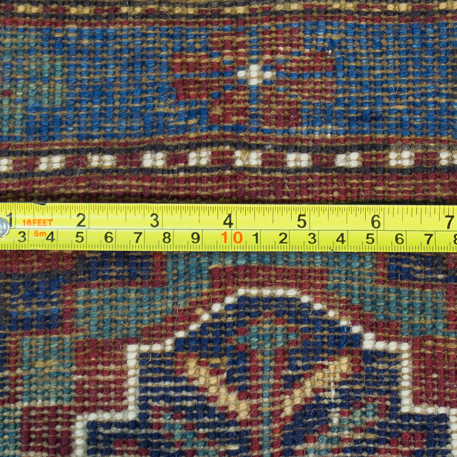 This elegant Kazak style Persian rug is a perfect pick for your home. Featuring stunning jewel-toned shades of ruby red and deep blue, this classic rug suits a variety of tastes and décor. Large diamond patterns play against the red background, which adds size and dimension to any space it sits. The border is dotted with cream colored motifs as well as flowery patterns for a pop of color. These hand-woven rugs feature a shorter pile than other Persian rug styles. This makes it extra durable for everyday traffic. The pure wool is stonewashed to give it that stunning antique finish. Make this investment, and it will be cherished in your family for decades.