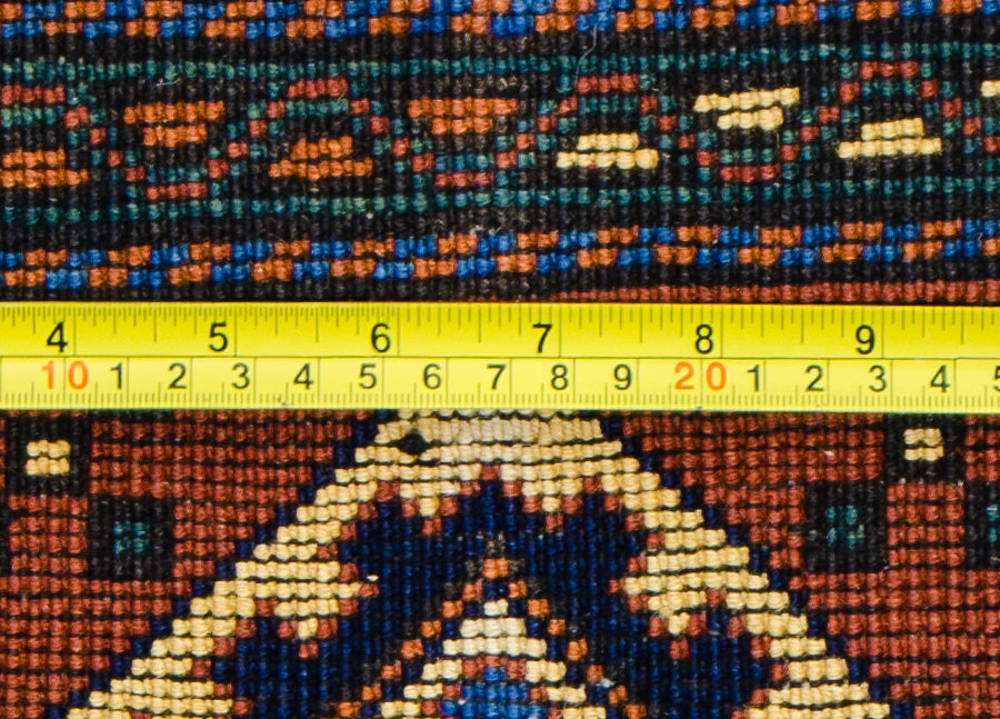 Step into the world of tribal Kehghai beauty with this authentic Persian rug. Three pointy stars rest inside a navy medallion in the center. Each is decorated with traditional Turkman motifs of arrows, stars, and more. Floral motifs and graphic shapes surround the borders of the rug for an authentic tribal finish to the look. It's dyed with classic shades of deep red, brown, and blue. Kehghai tribal artisans hand-knotted this beautiful Persian rug using classic methods and designs to the area. It was made with thick pure wool to ensure it stays strong and vibrant for years of everyday use.