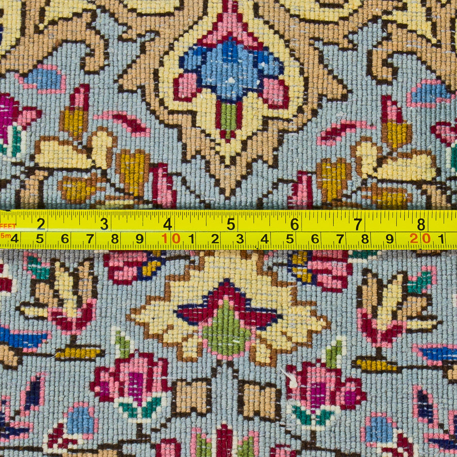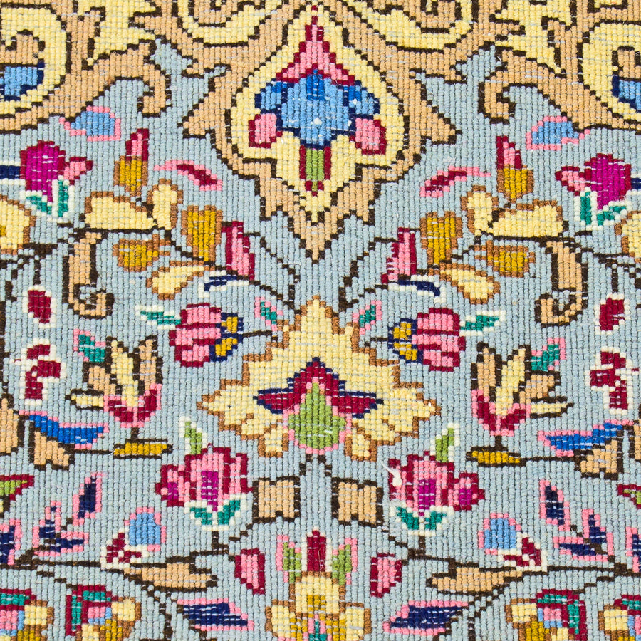 This stunning Kirman Persian rug features all of the intricate colors and patterns that make this style so unforgettable. The vibrant yellow background is complemented by an array of blues, pinks, reds, and more. Each time you look at this rug, you’ll see something new to surprise and delight you. Layers of borders build on each other with flowery and dotted motifs. These rugs are delicately hand-knotted by Iranian craftsman. Each detail is an artistic expression of the weaver, making this wool rug an investment to cherish for life. The hand-woven style is durable against years of everyday use, so it’s an item you’ll enjoy for years to come.