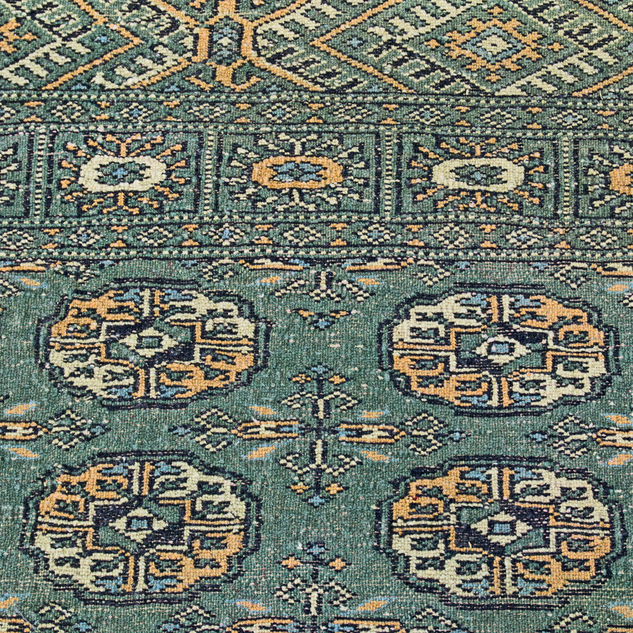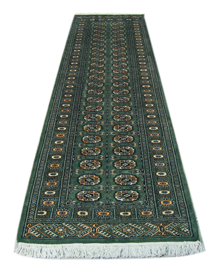 Enjoy the finest of Oriental rugs with this Pak Kashmir runner. Circular medallions in various shades of orange and white add dimension to the emerald green rug. Simple shapes combine to make vibrant patterns inside the circles. The border features authentic Kashmir motifs for quality details. This runner rug is perfect for your entryway or kitchen. This runner rug was handwoven by Pakistani artisans. They use traditional techniques, materials, and patterns that have been adored for centuries. It's made with a blend of wool and cotton to ensure lasting durability and value. Add this rug to your home decor, and it will be enjoyed for years to come.