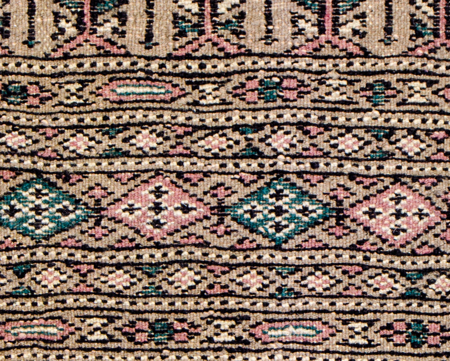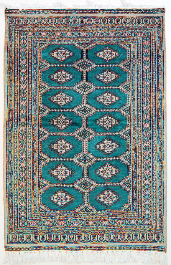 Enjoy turquoise brilliance with this Pakistani Kashmir rug. THis unique rug features a repeating diamond pattern with graphic details. The cream-colored medallions contrast the stunning turquoise background that catches the eye. It features the signature multi-border finish that adds dimension to the design. This rug easily adds vibrant sophistication to any room in your home. Hand-crafted by authentic Pakistani artisans, this rug is made to last for years of use. The wool and cotton blend creates a nice balance of durability and affordability. The wool ensures it can hold up to regular use. It's vibrant beauty will be enjoyed by you and your family for years.