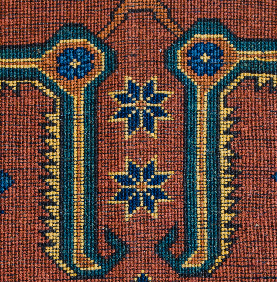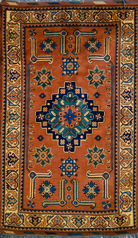 Enjoy classic motifs and colors of Oriental rugs with this Pakistani creation. A large central medallion in shades of aqua and navy blue draws the eye to the center. Traditional floral motifs and arrows surround it to add complexity to the design. Heart shaped motifs fill the border of the rug. A classic palette of browns, reds, and blues makes this rug easy to blend with your home decor. This authentic Oriental rug was hand-knotted by Pakistani artisans. They use the ancient and popular construction methods of the region. This thick and durable rug is made of pure wool, so it holds up to heavy traffic.