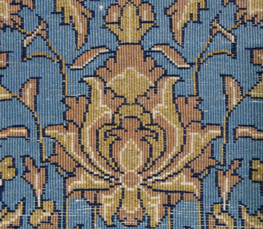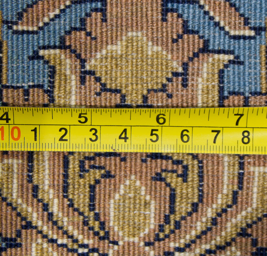 This classic wool rug displays the best of traditional Persian patterns and techniques. The design features beautiful florals and patterns signature to the Qum region. It continues centuries of tradition. It's dyed primarily blue and green, and it has details in gold. This beautiful rug is easy to blend with modern decor, and it would be an excellent choice to add warmth to a living room. Qum artisans hand-knotted this authentic Persian rug using traditional techniques and patterns. It's made of pure wool, which provides lasting durability that stays in top condition for decades. This is a great find that will be a beautiful addition to your rug collection.