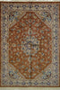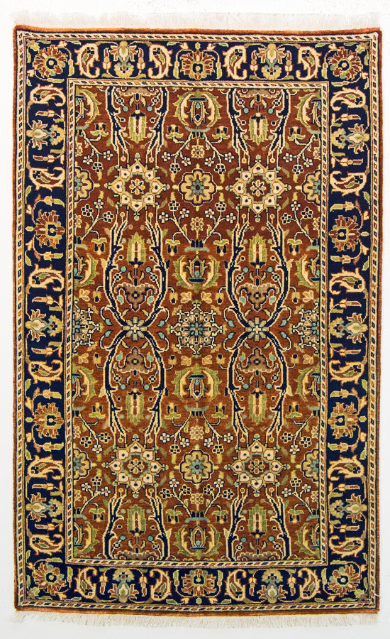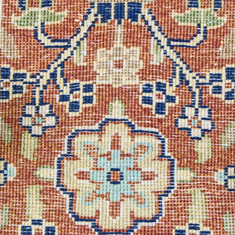 Explore the intricate details and techniques of Sultanabad craftsmanship with this authentic Persian rug. Large tribal motifs in shades of green and gold fill the central area. Small blooming flowers add dimention and detail to this stunning rug. The wide border features paisley shapes and simple floral motifs to finish out this elegant piece. The orange central background is complimented by the dark blue border. This Sultanabad style rug was handmade by talented regional artisans who continue the traditional techniques and designs. The wool and cotton blend provides a balance between durability and softness you are sure to enjoy in your home for years.