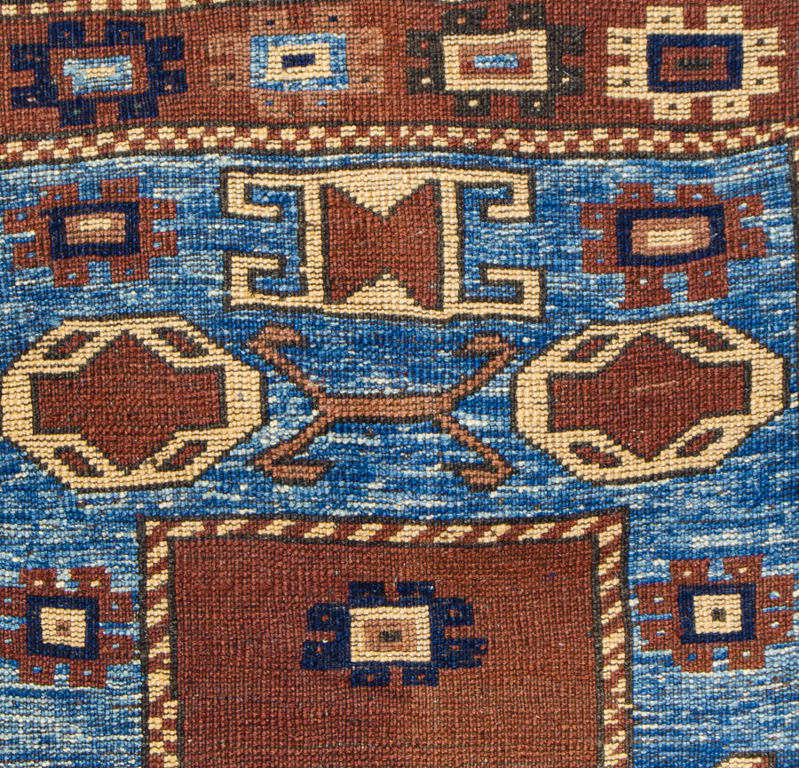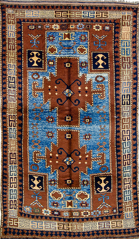 Collectors adore this Kazaki Persian beauty. This Turkish rug displays traditional patterns to the Kazaki tribe. For a twist, the artisan used a beautiful bright blue to contrast with the traditional red colors. The blue catches the eye against the variety of tribal motifs. Classic multiple borders add an elegant finishing touch to the rug. This authentic Persian rug is handwoven by Kazaki artisans with traditional methods and patterns. The stonewashed wool creates the dynamic blue hues. The wool itself ensures this rug holds up to high-traffic areas. Place this unique rug in your home, and it will remain vibrant for years to come.