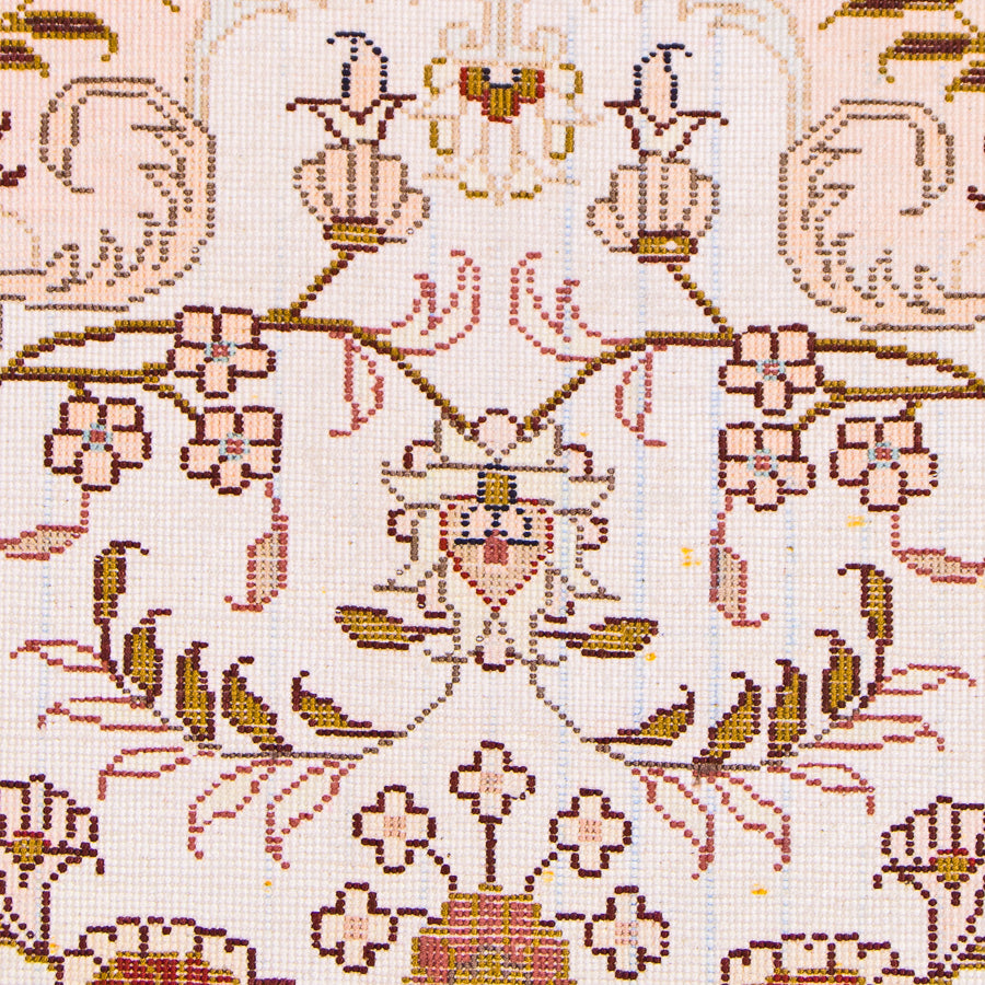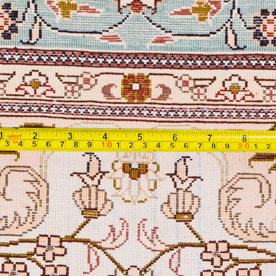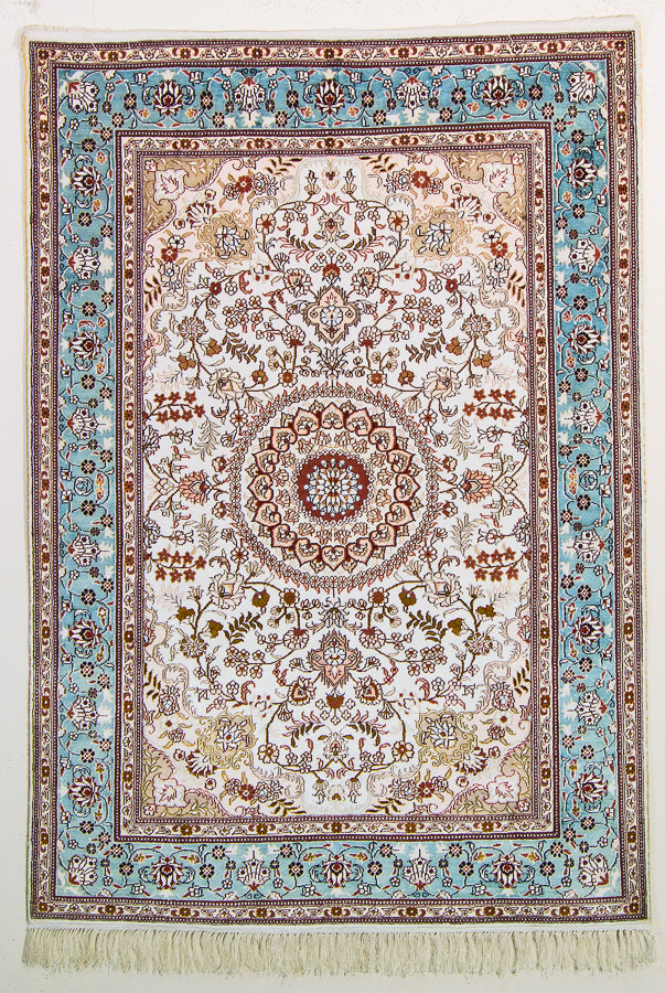 If you're looking for shimmering elegance to display in your home, this authentic Oriental rug is a perfect pick. It features patterns and motifs traditional to the Turkistan region. A large central medallion gives way to sweeping vines, blooming flowers and more. A sky blue border compliments the main shades of soft pink and red. It easily adds elegance to your home decor. This 100% silk rug was handmade in China in the traditional Turkistan style. Silk rugs are unique in their supreme soft luxury. They cut the pile short, which allows the intricate patterns to appear even more vibrant. This silky dream makes a beautiful addition to your rug collection.