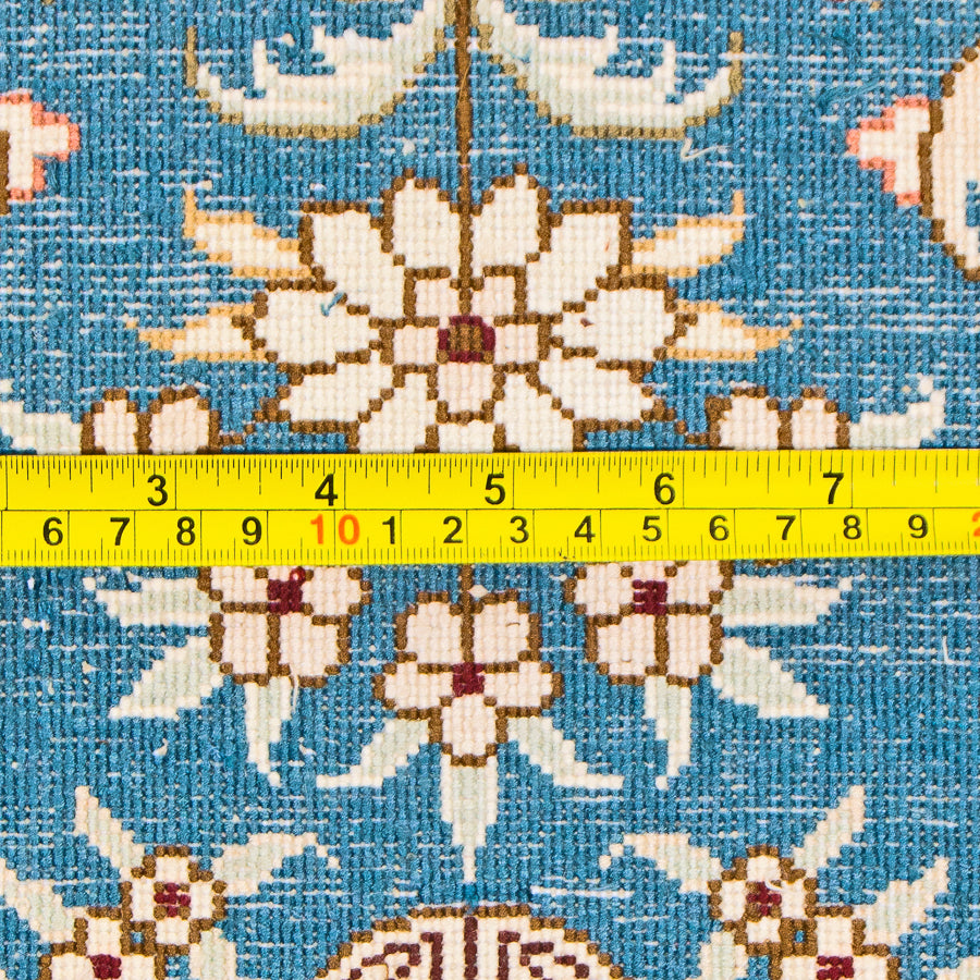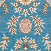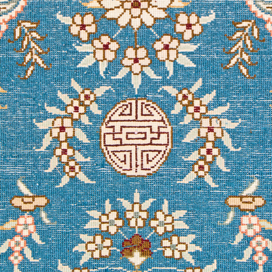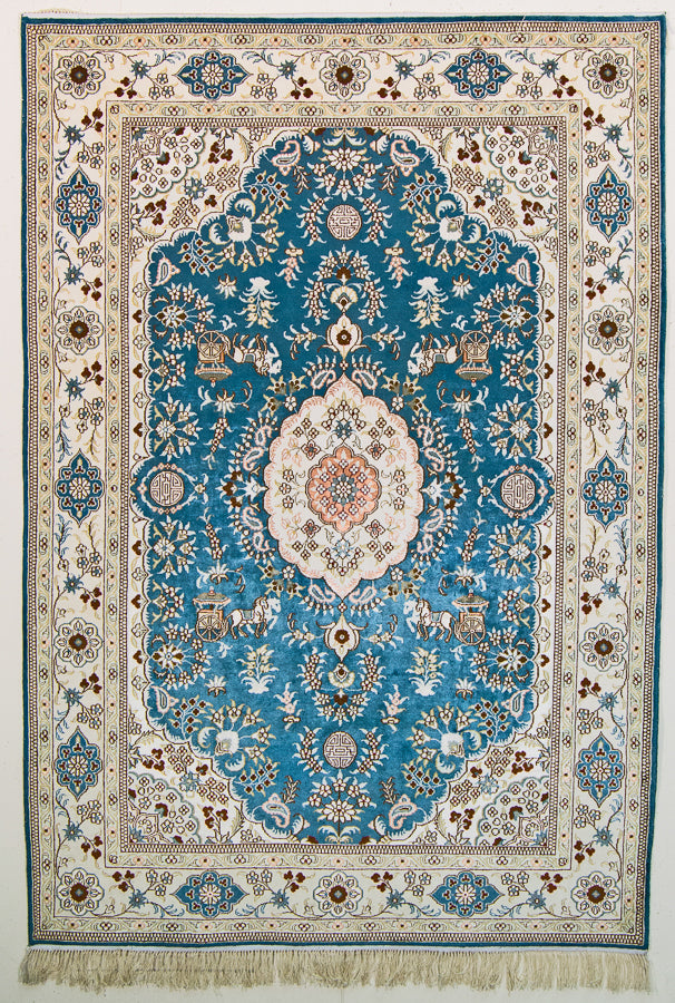 Whimsy and romance come to life in this authentic silk rug. The bright blue center depicts traditional flowers and sweeping designs typical of the Turkistan style. Horse-drawn carriages, Oriental symbols, and more can be found in the intricate design. A cream-colored border compliments the blue center to a stunning effect. This elegant rug makes a perfect area rug for a living room. Chinese artisans handmade this authentic Oriental rug in the centuries-old Turkistan style. It's made of 100% silk, so this rug is delightfully soft under your feet. This will make a fine addition to your rug collection that will last for decades.