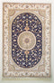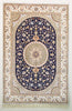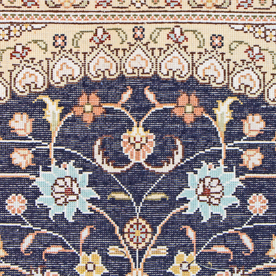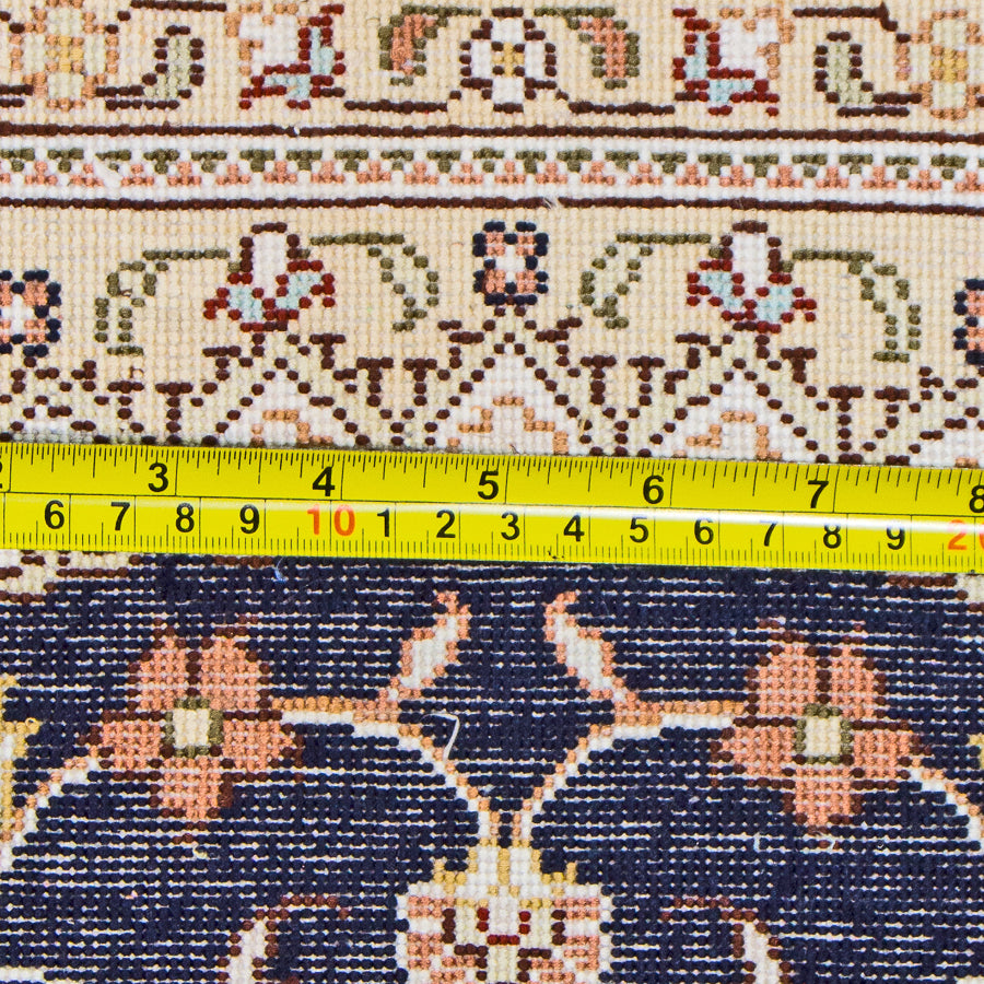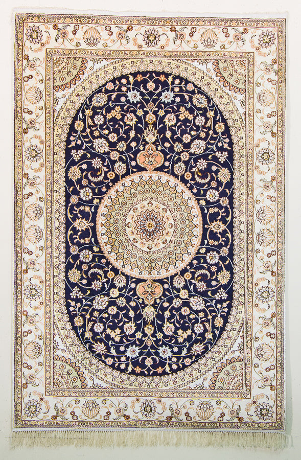 Bring traditional beauty and vibrant colors into your home with this authentic Oriental rug. A beautiful dark blue surrounds the large circular medallion in the center of the rug. Its kaleidoscopic detail matches the traditional Turkistani style to perfection. The wide and ornate border depicts more images of beautiful flowers to complete the look of this elegant rug. Turkistani artisans hand-knotted this Oriental silk rug using the centuries-old techniques of the region. The pure silk pile has a vibrant and shimmering finish, and it feels soft on your skin. Add this to your rug collection, and you are sure to enjoy it for years to come.